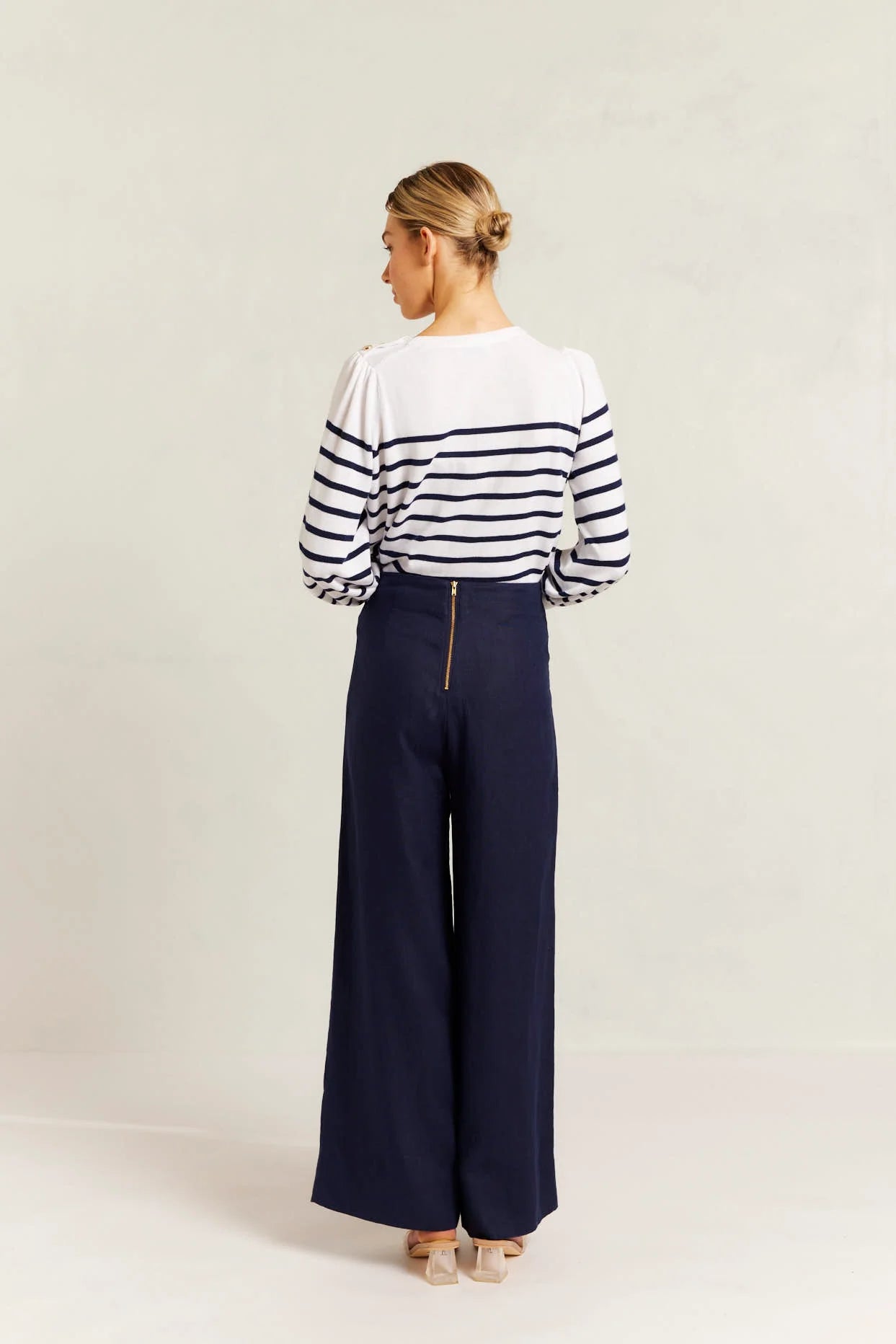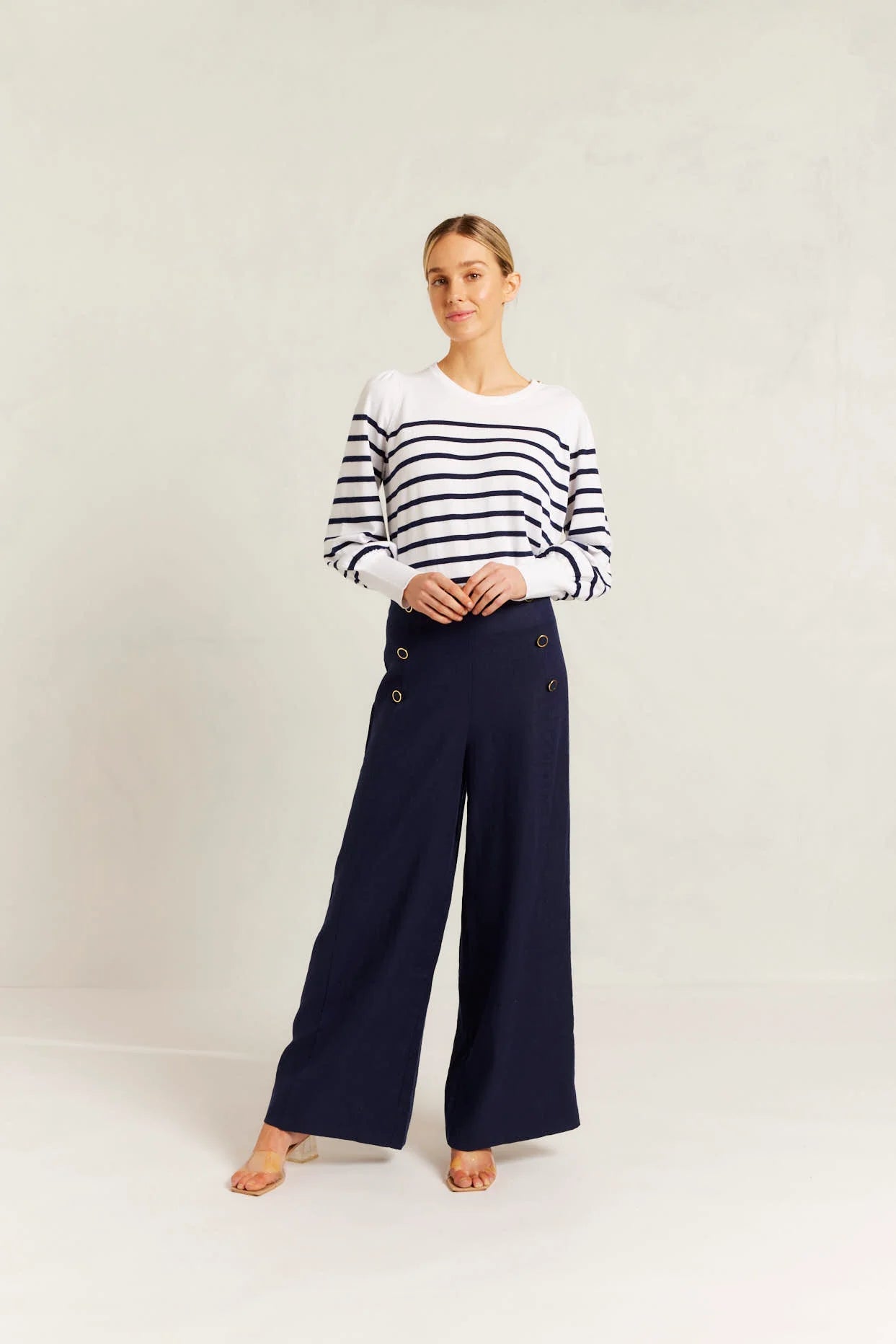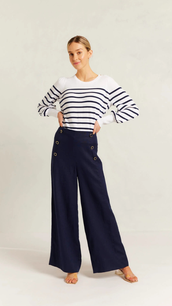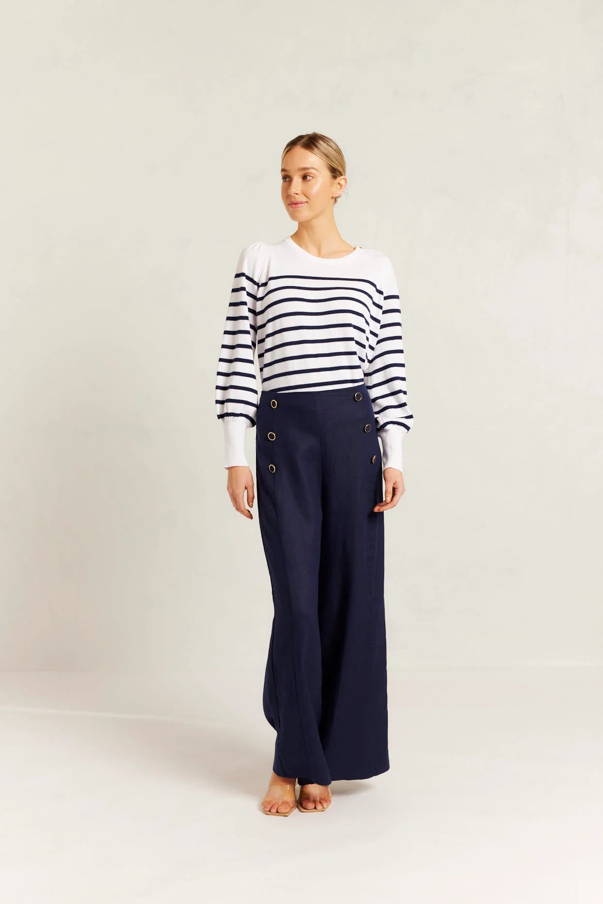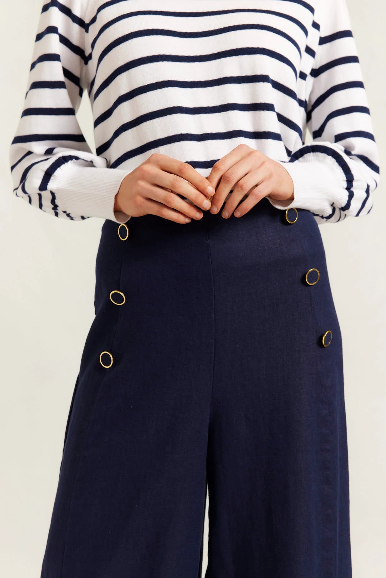Our Atlas Pants are a nautical-inspired statement piece, featuring a flattering high-rise fit with bold button detailing along the sides. Crafted from a lightweight fabric with a wide-leg silhouette, they deliver effortless elegance and timeless style.