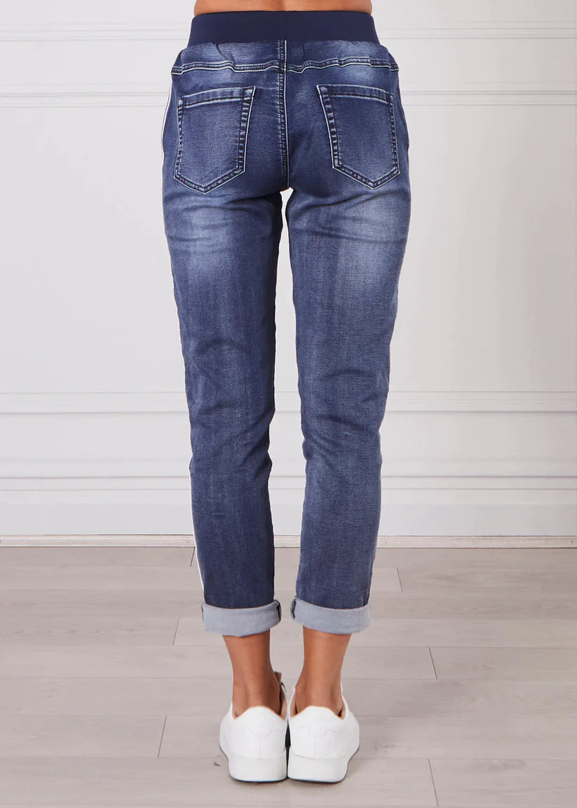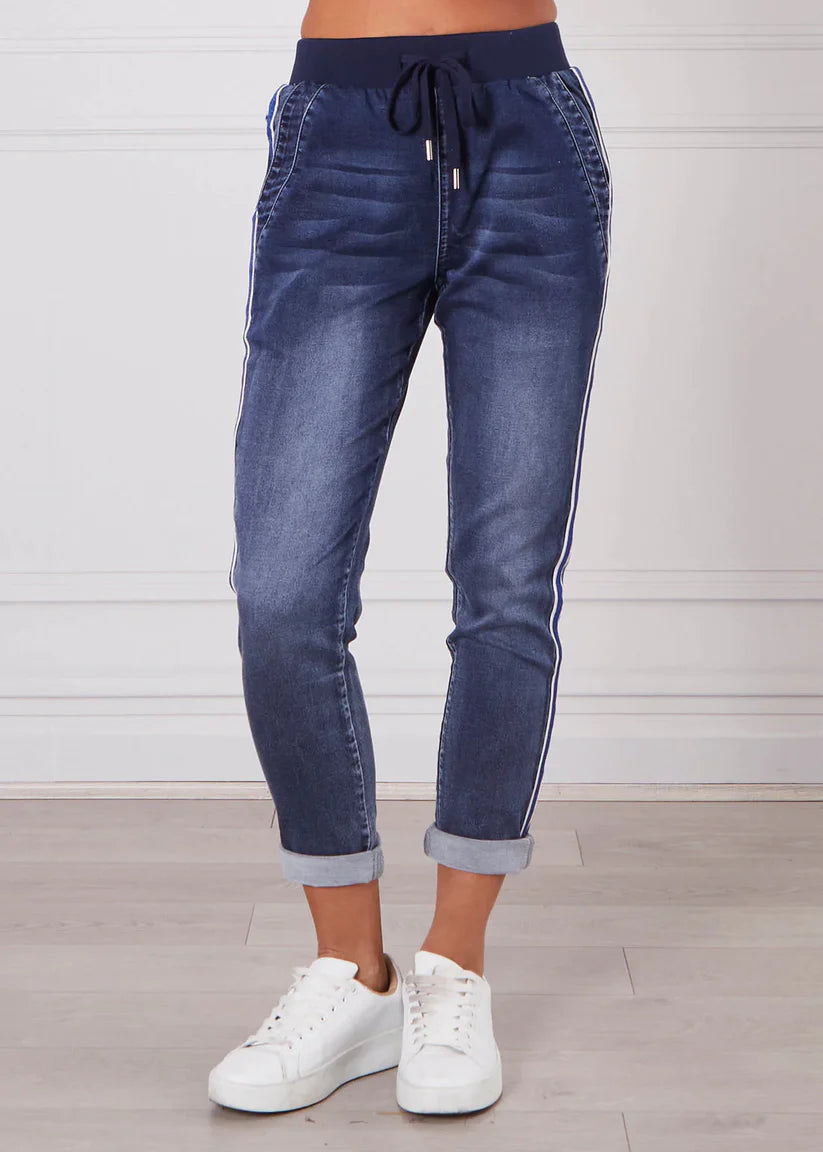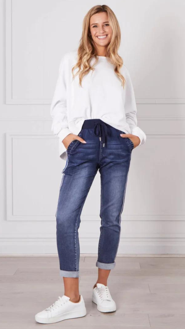 Super comfy denim jogger with high-waisted fit & elastic waistband with drawstring, it is now easier than ever to get the comfort chic you have been looking for.