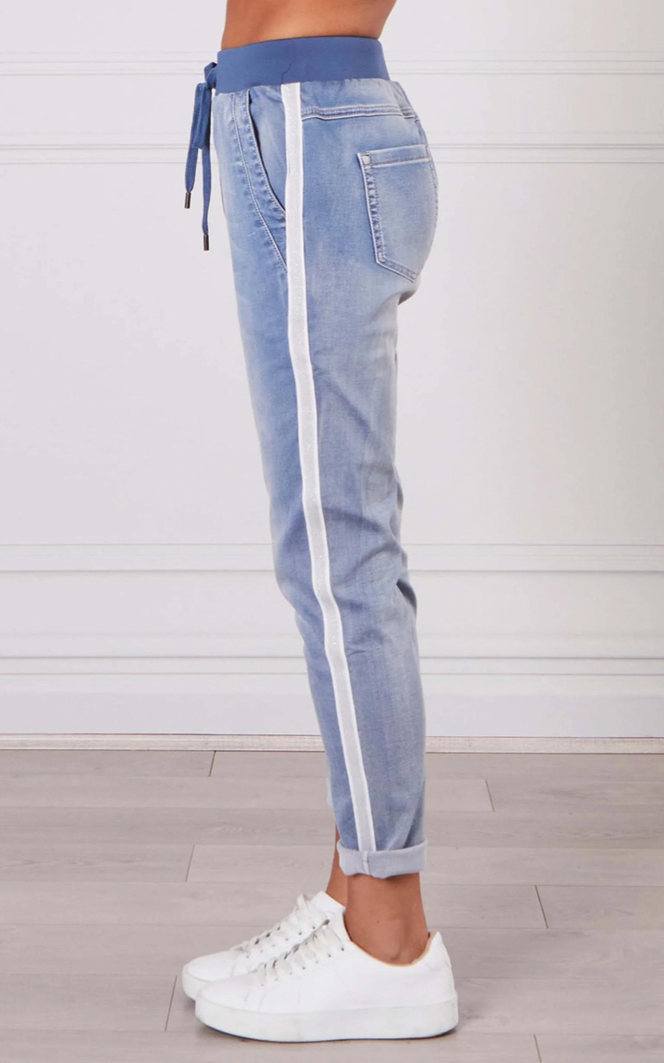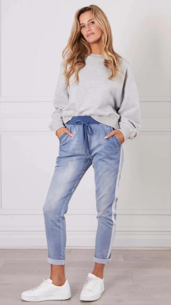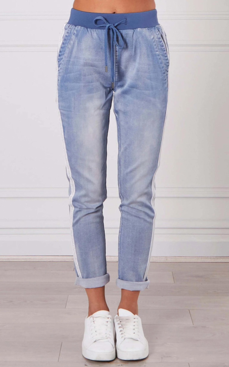 Super comfy denim jogger with high-waisted fit & elastic waistband with drawstring, it is now easier than ever to get the comfort chic you have been looking for.