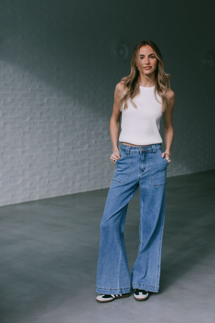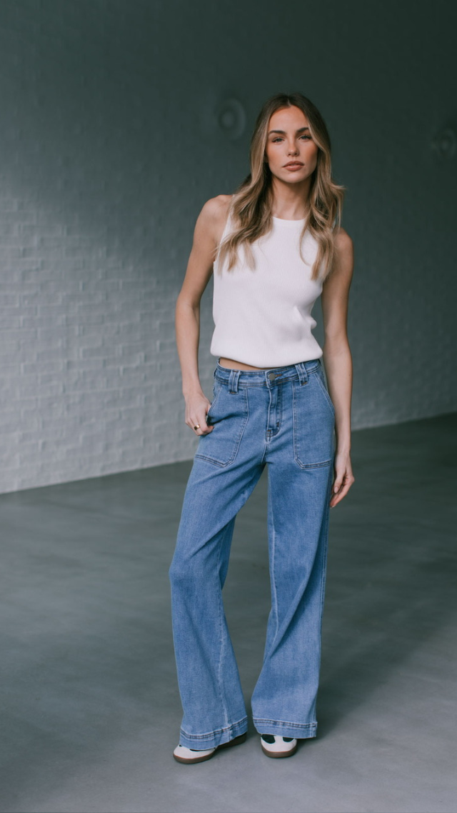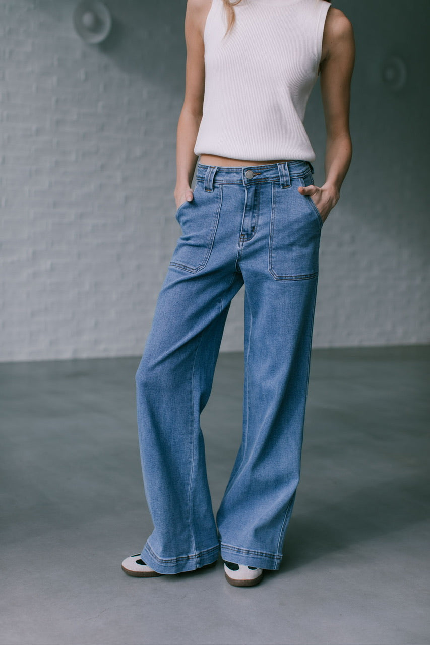 Meet your new denim essential: the Lila Jeans in Mid Blue. With a flattering high-rise fit and relaxed wide-leg silhouette, these jeans strike the perfect balance between laid-back cool and timeless style. The patch pockets add a touch of utility-inspired edge, while the soft mid-blue wash makes them endlessly versatile — from casual coffee runs to elevated weekend outings. Pair them with sneakers for everyday ease or dress them up with heels for a polished, modern look.