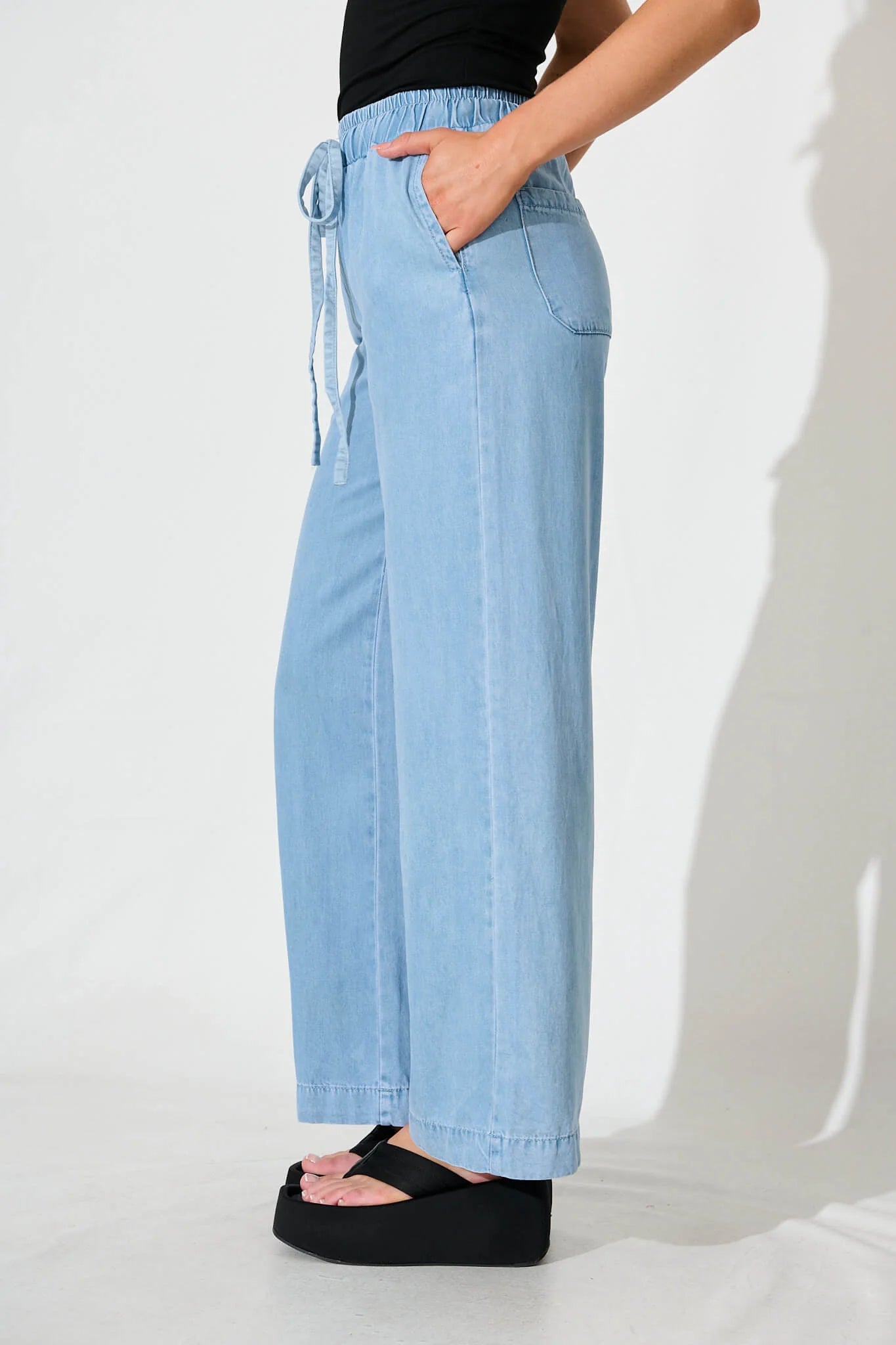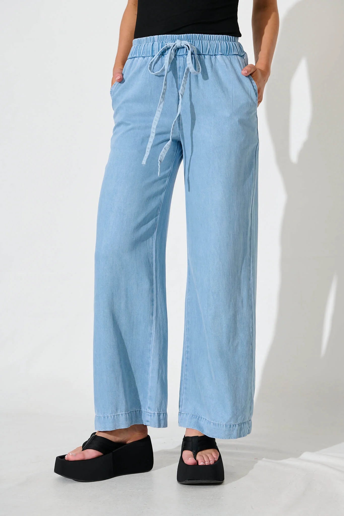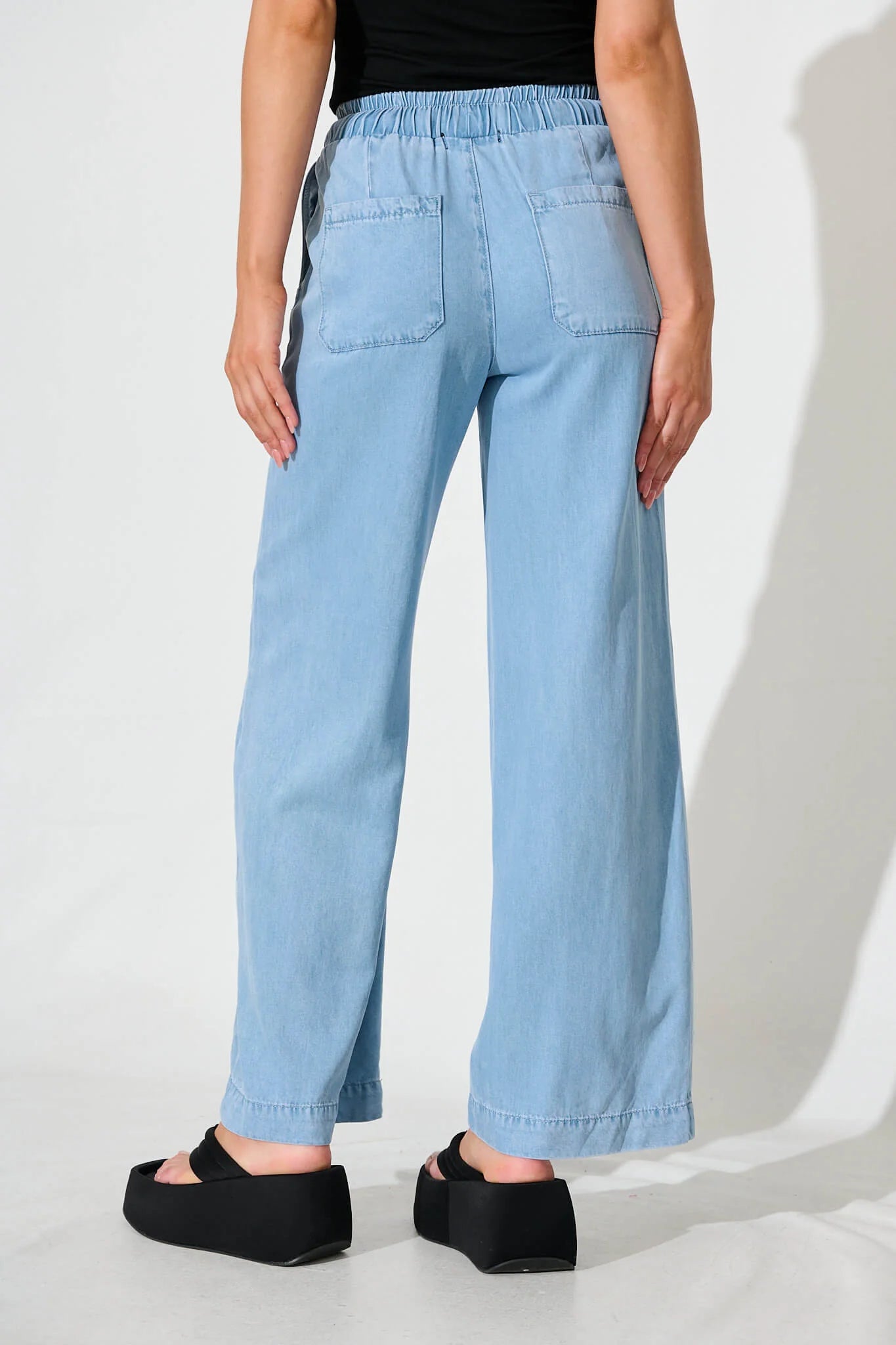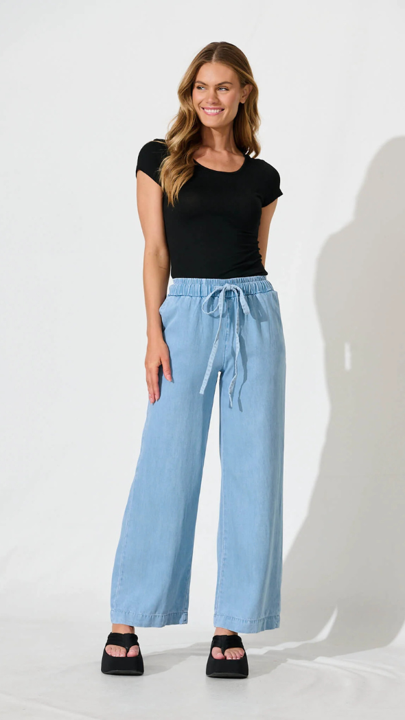 Our Saxby Pants is the perfect way to casualise denim this season. Made from a lightweight chambray, features include an elastic waistline, wide leg pants and pocket detail. Team with your basic tee and summer platforms for a chic look.