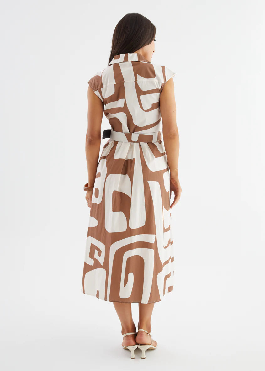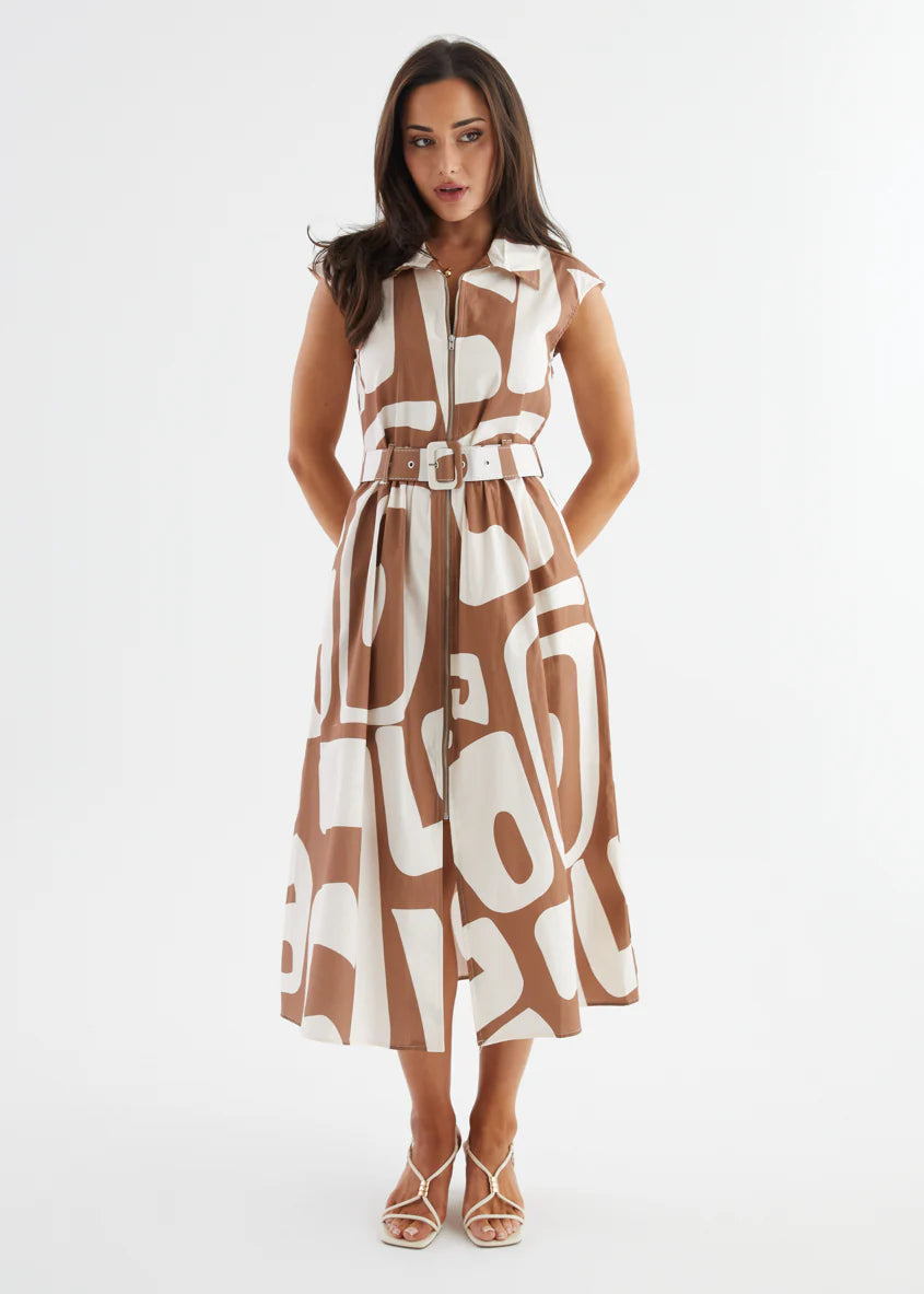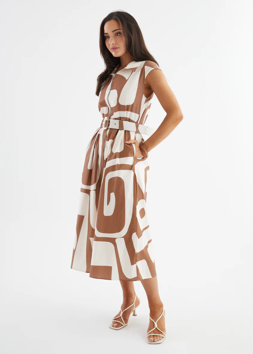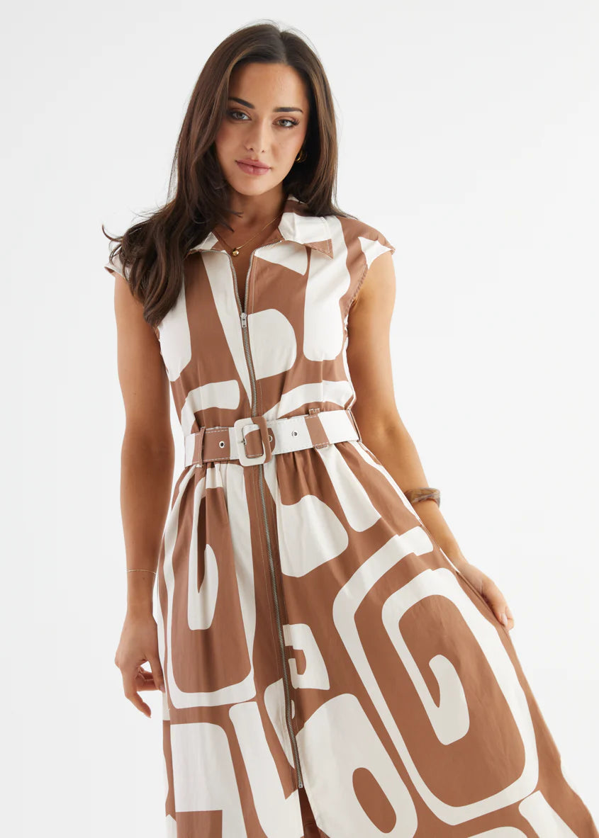 The Ashcroft Dress channels vintage cool with a contemporary twist. Featuring oversized abstract prints and a sharp collared neckline, this belted midi is all about confident style and clean lines. Whether you choose deep navy or earthy coffee, it’s the kind of dress that turns a simple outing into a power moment. Think art gallery energy meets city brunch sophistication.