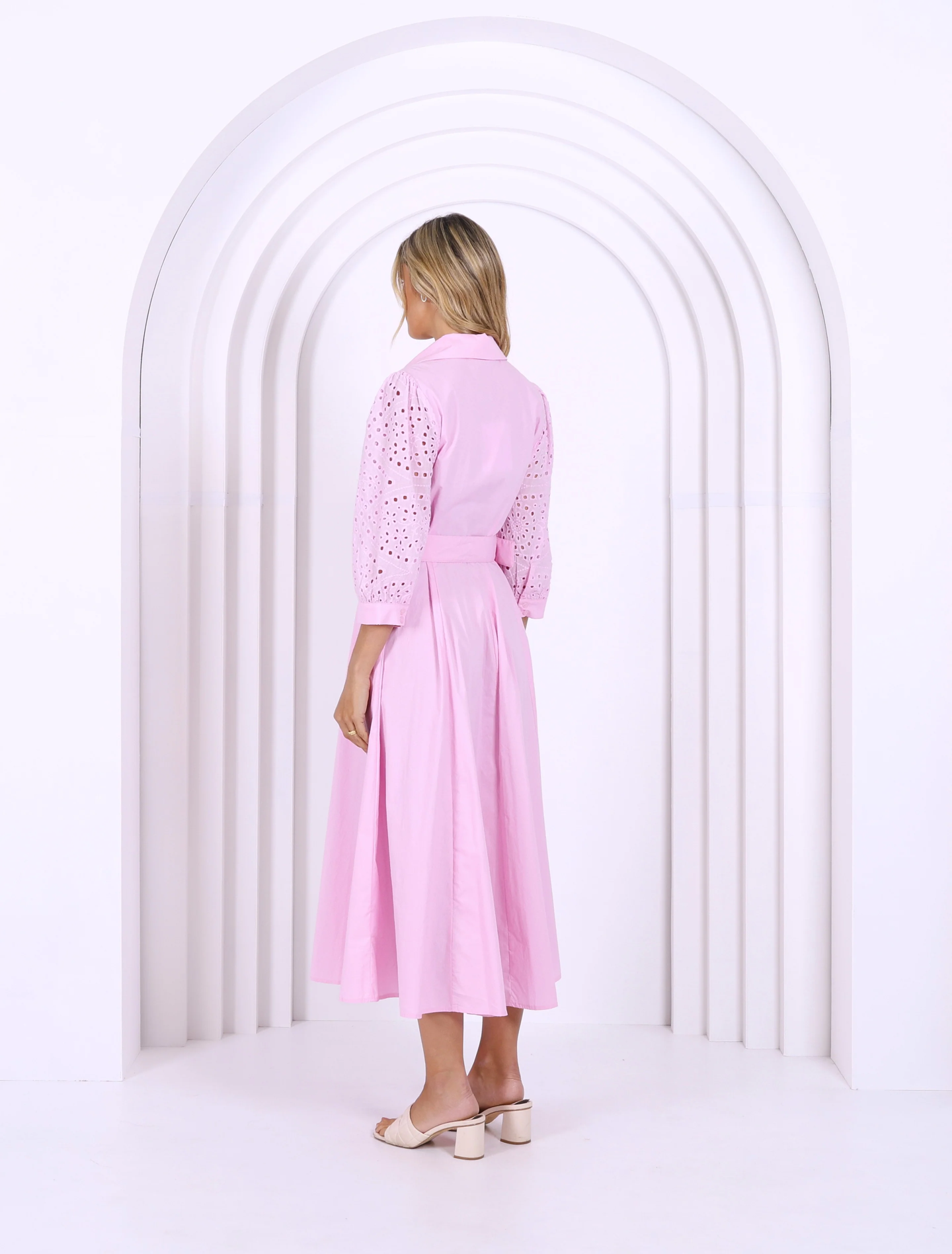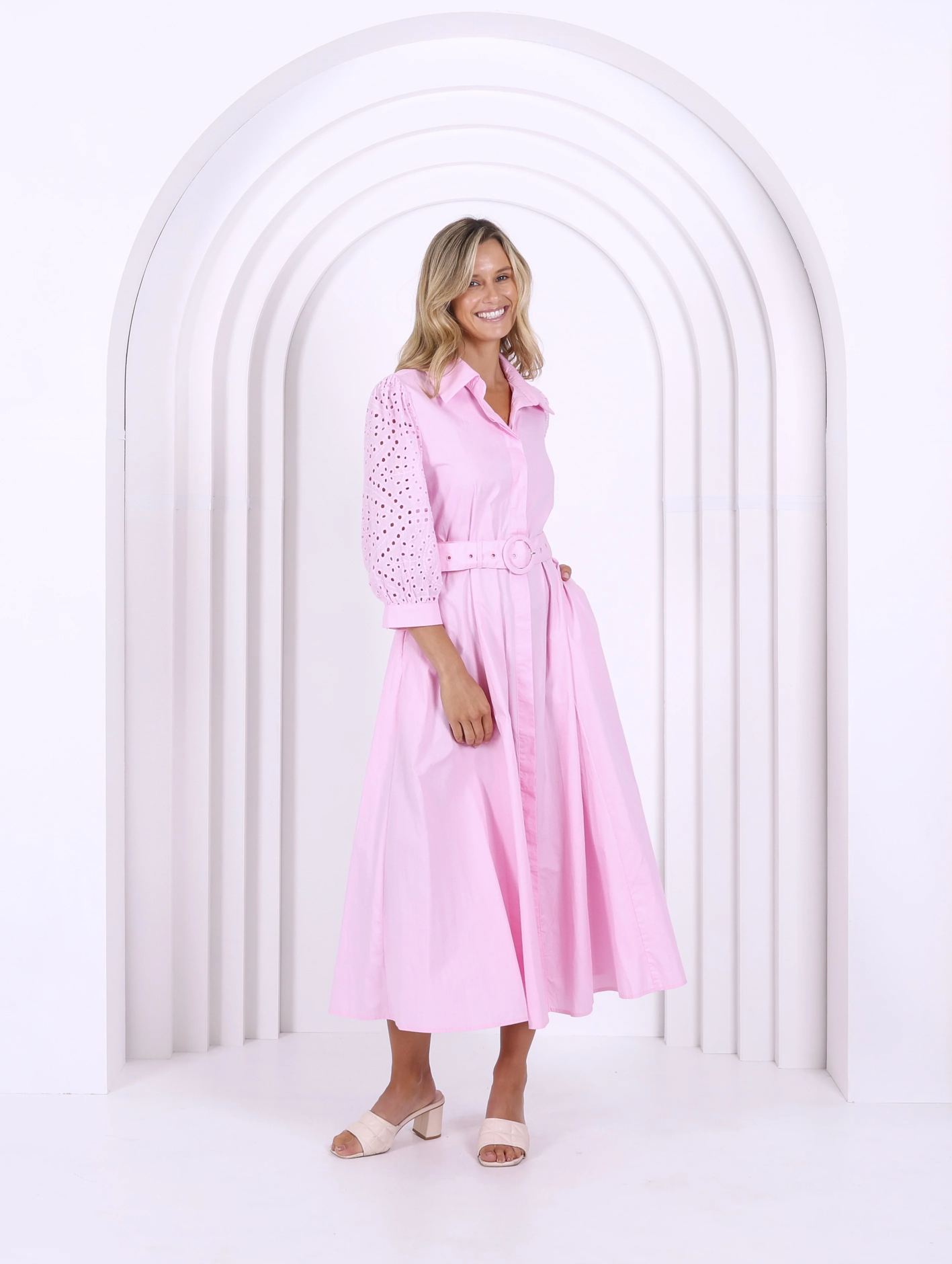 The Chloe Dress blends timeless shirt-dress tailoring with a feminine twist. Featuring delicate broderie anglaise sleeves, a cinched waist with a matching belt, and a voluminous skirt, this piece moves with graceful ease. Whether you choose soft pink or fresh white, Chloe brings effortless elegance to long lunches, garden parties, or everyday moments that call for something special.