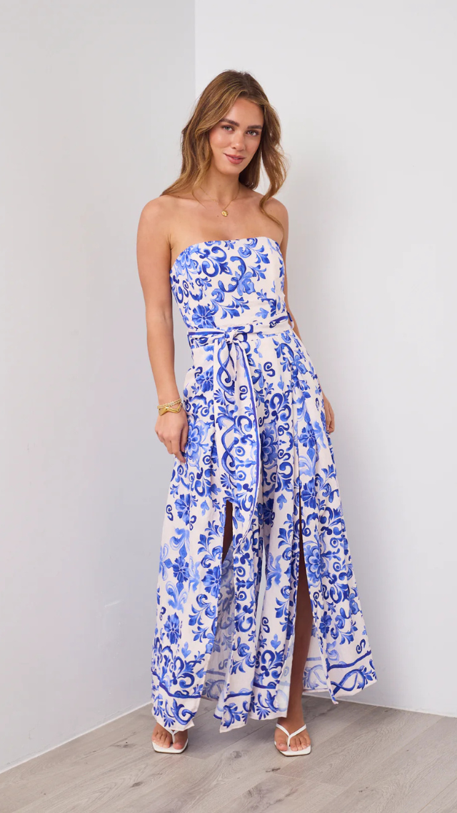 The Camilla Jumpsuit in Jardin captures effortless elegance with its strapless silhouette and striking blue-and-white print. Crafted from a soft, flowing fabric that moves beautifully, this wide-leg design creates the illusion of a dress while offering the comfort and ease of a jumpsuit. The self-tie belt cinches the waist for a flattering fit, making it the perfect piece for summer soirées, long lunches, or sunset getaways.