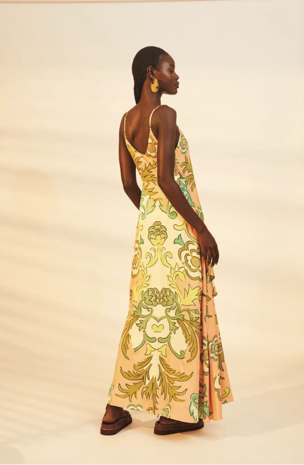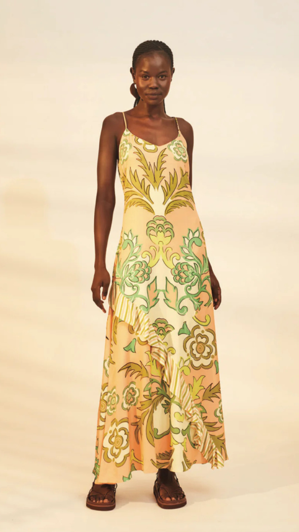 Our Lucia Bias Dress is the epitome of effortless elegance. Designed with a flattering bias-cut silhouette, this dress drapes beautifully over the body. Its vintage-inspired floral print and subtle striped detailing create a timeless yet modern aesthetic, perfect for day-to-night dressing.