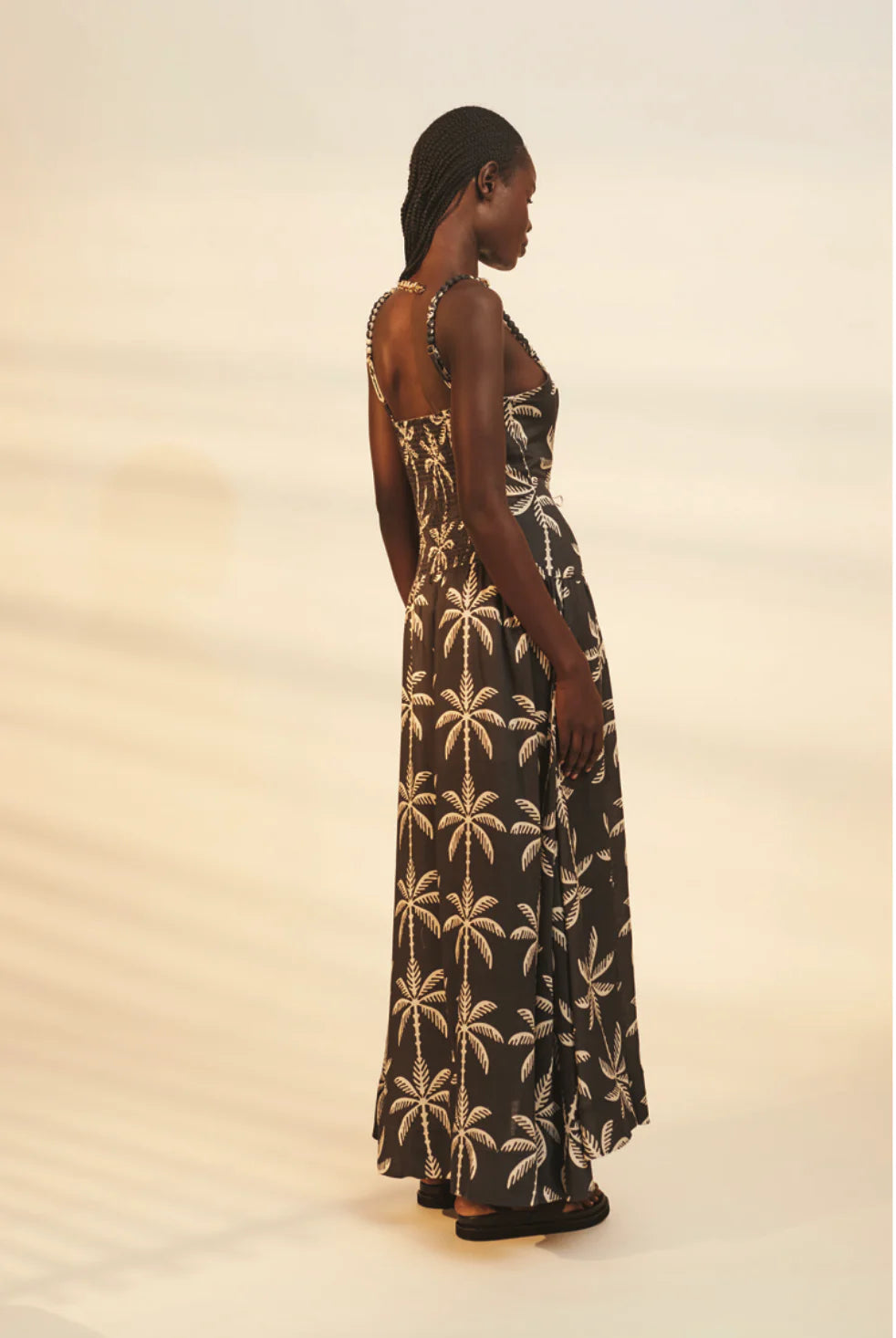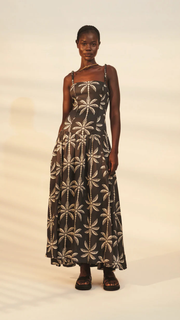 Meet Abena, the dress that transports you to sun-drenched days and balmy nights. Crafted in a lightweight, flowy silhouette, this beauty features delicate straps, a flattering fitted bodice, and a tiered skirt that moves with effortless grace. The striking palm print set against a deep noir background gives it that perfect mix of bold and timeless—ideal for breezy beachside strolls or candlelit summer soirées.