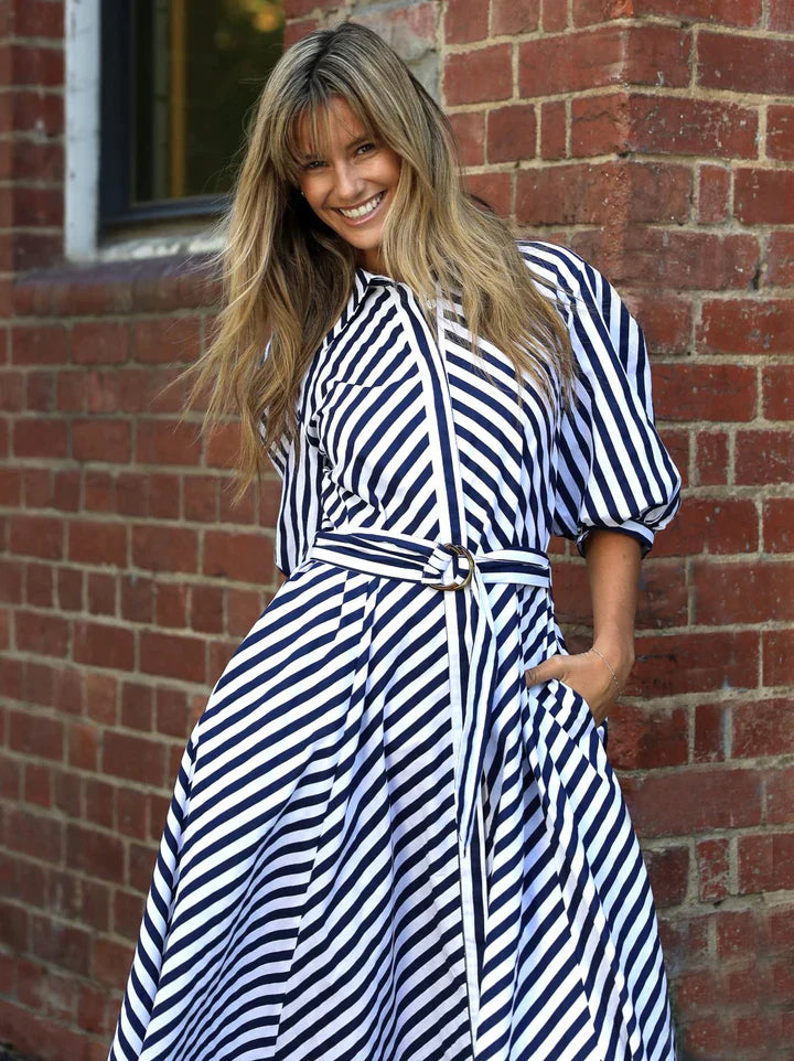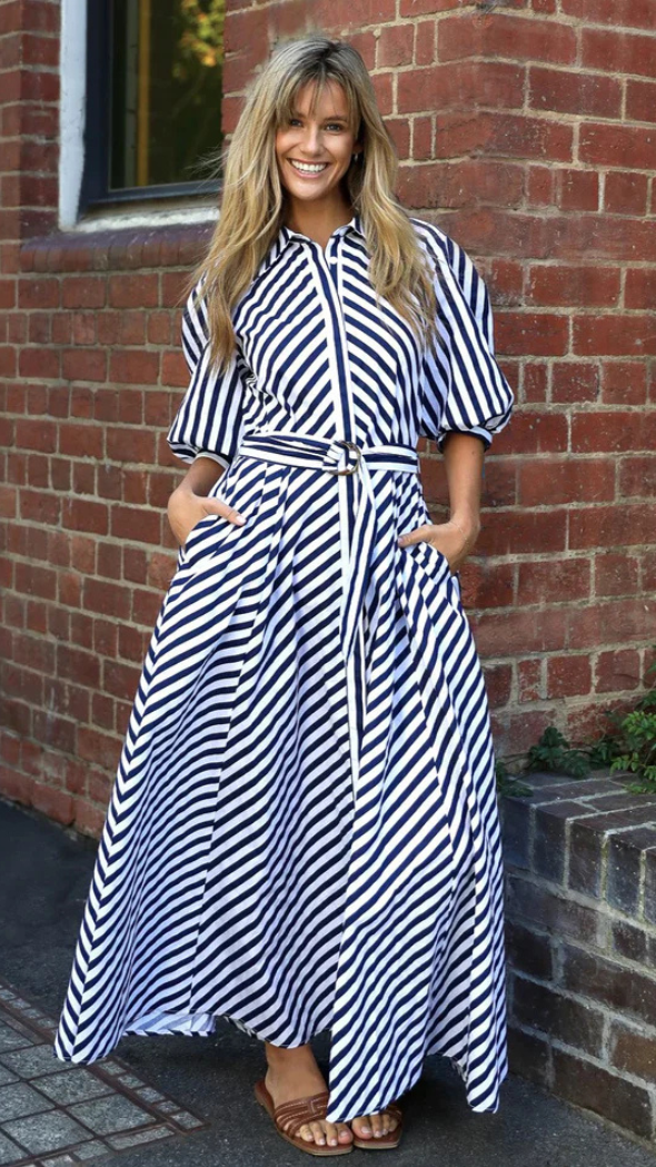 The Bianca Dress is a timeless blend of classic and contemporary, featuring bold navy and white stripes, a flattering belted waist, and a flowing maxi silhouette. With its chic collared neckline and voluminous sleeves, it’s the perfect statement piece for effortless elegance.