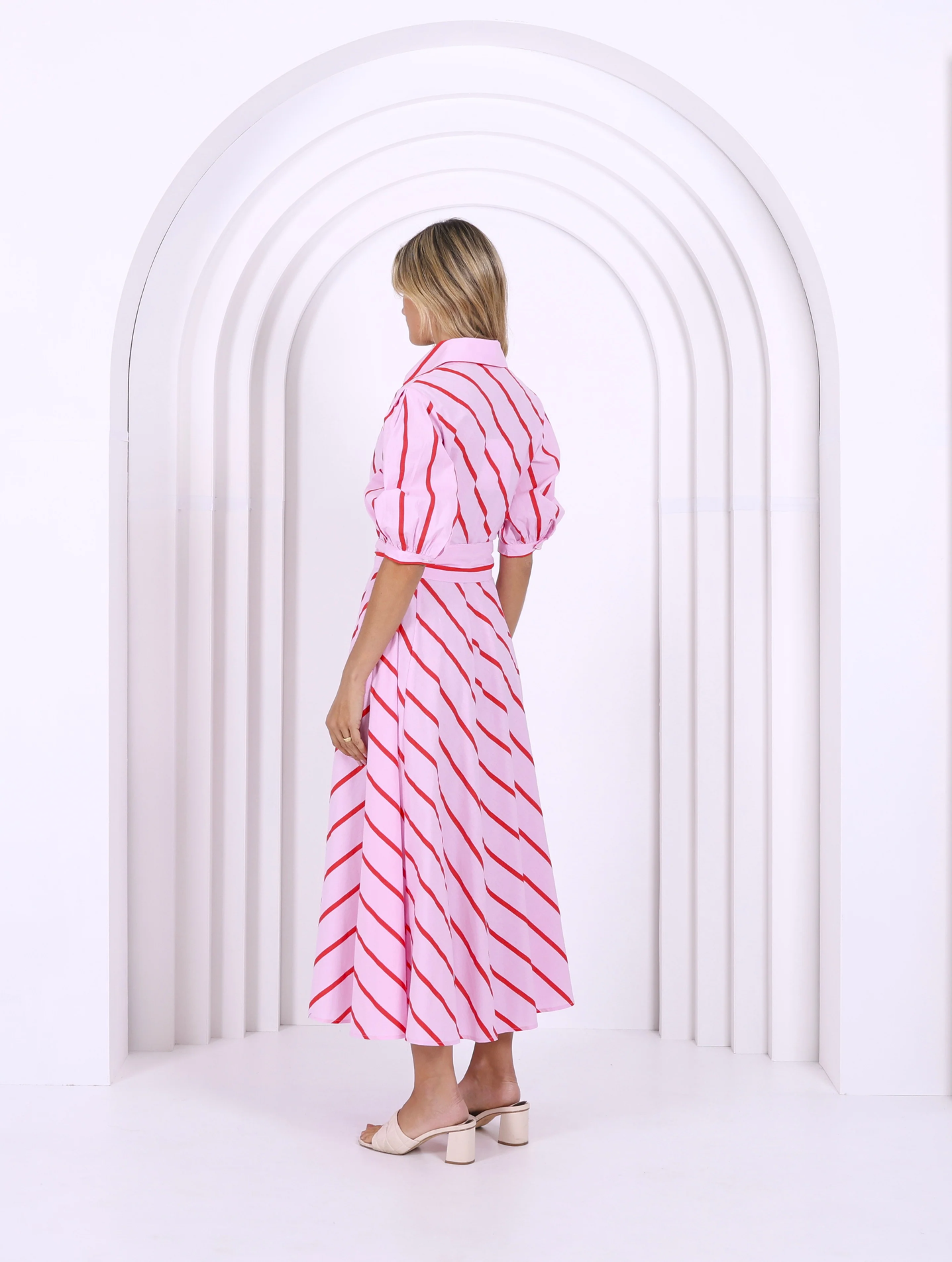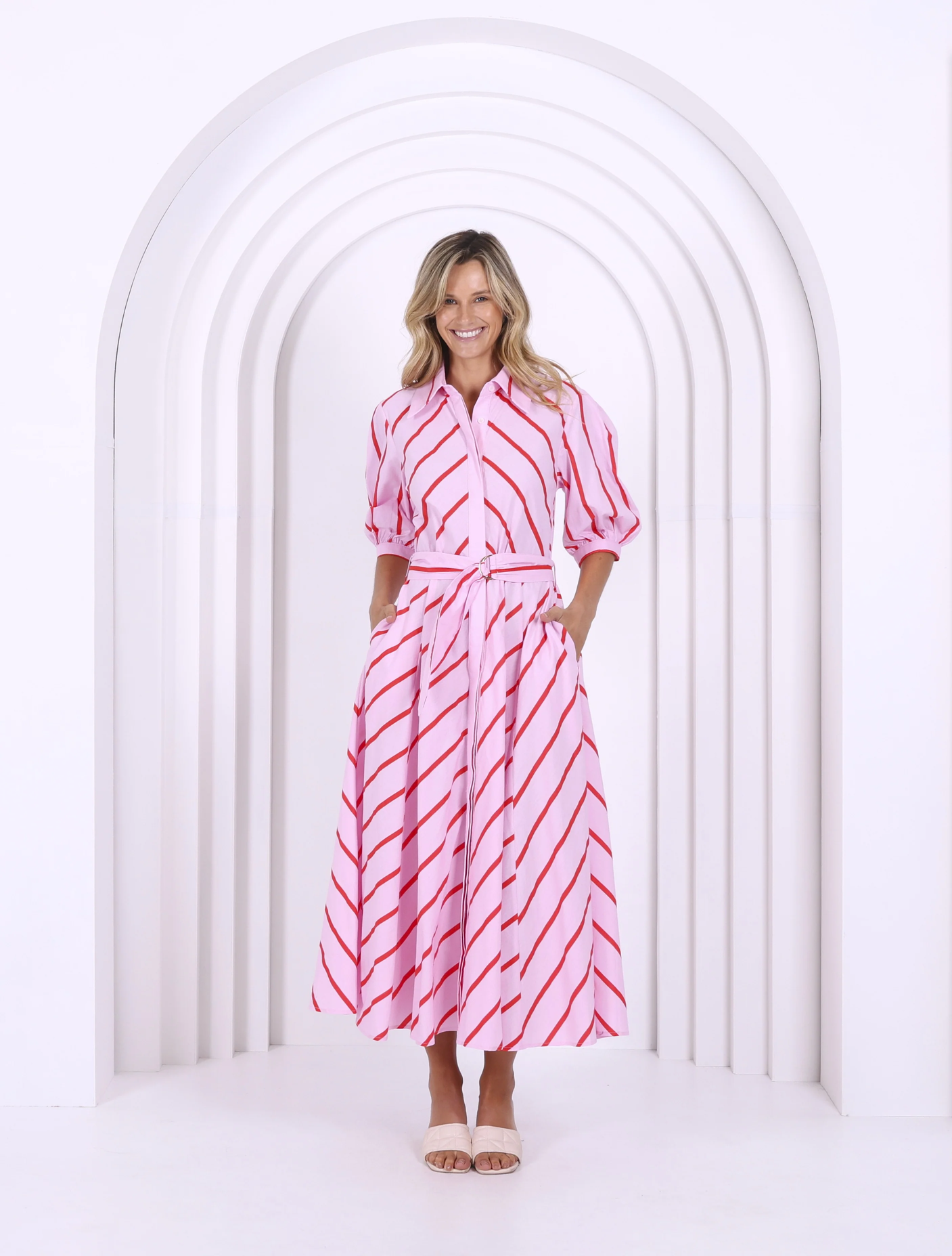 The Bianca Dress is your go-to for everyday elegance with a fun twist. With its classic shirt-dress structure, vibrant diagonal stripes, and softly gathered skirt, it flatters while keeping things light and breezy. Finished with a belted waist and puffed sleeves, Bianca is designed to take you from workday chic to weekend charm in a single twirl — available in multiple prints to match your mood.