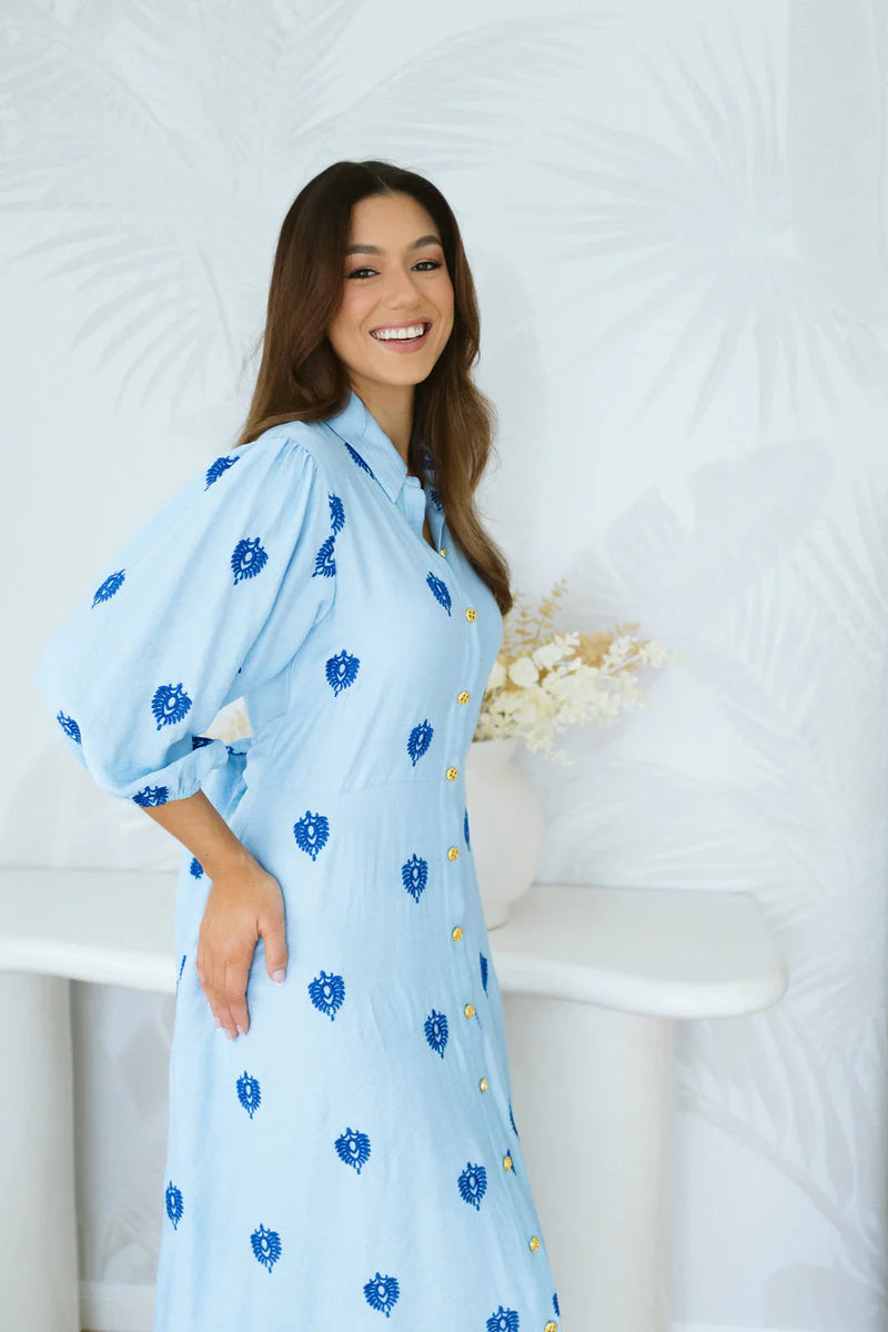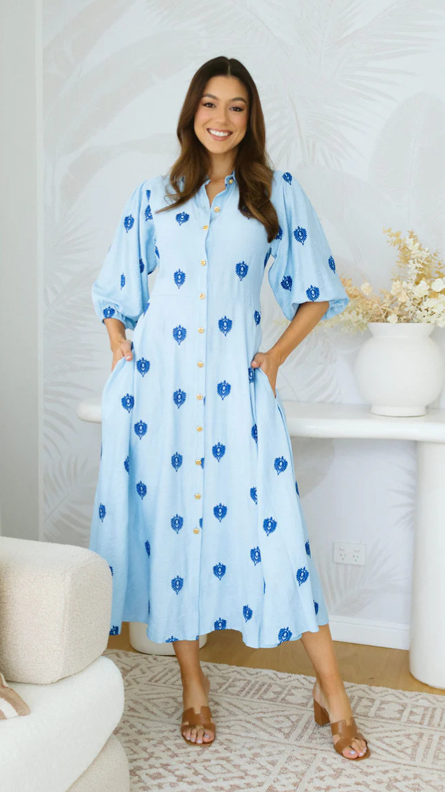 The Dempsey Dress captures laid-back charm with a timeless twist. Crafted in a soft sky-blue hue and scattered with intricate cobalt embroidery, it’s designed to bring ease and grace into your day. With a full button-down front, flattering fit-and-flare silhouette, and blouson sleeves, Dempsey is the kind of dress that feels as good as it looks — perfect for market mornings, garden gatherings, or simply feeling lovely at home.