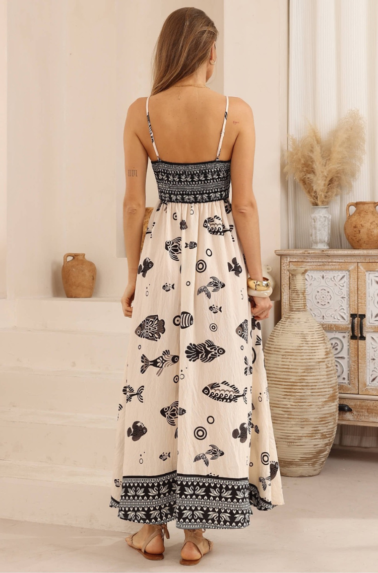 Designed with a softly structured bodice and a flowing full-length skirt, it moves beautifully while still feeling easy and comfortable. Delicate straps and a clean neckline keep the look balanced, letting the print speak without overpowering the silhouette.