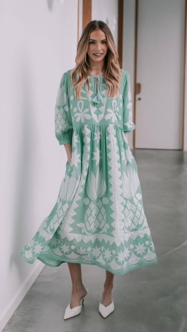 The Maraise Dress brings together artistry and ease in a silhouette that feels both grounded and graceful. With its hand-inspired embroidery, soft volume, and signature scalloped hem, this midi is made for slow mornings, golden hour dinners, and everything in between. Available in blush pink and a serene mint, Maraise invites you to move through the world with comfort, confidence, and quiet charm.