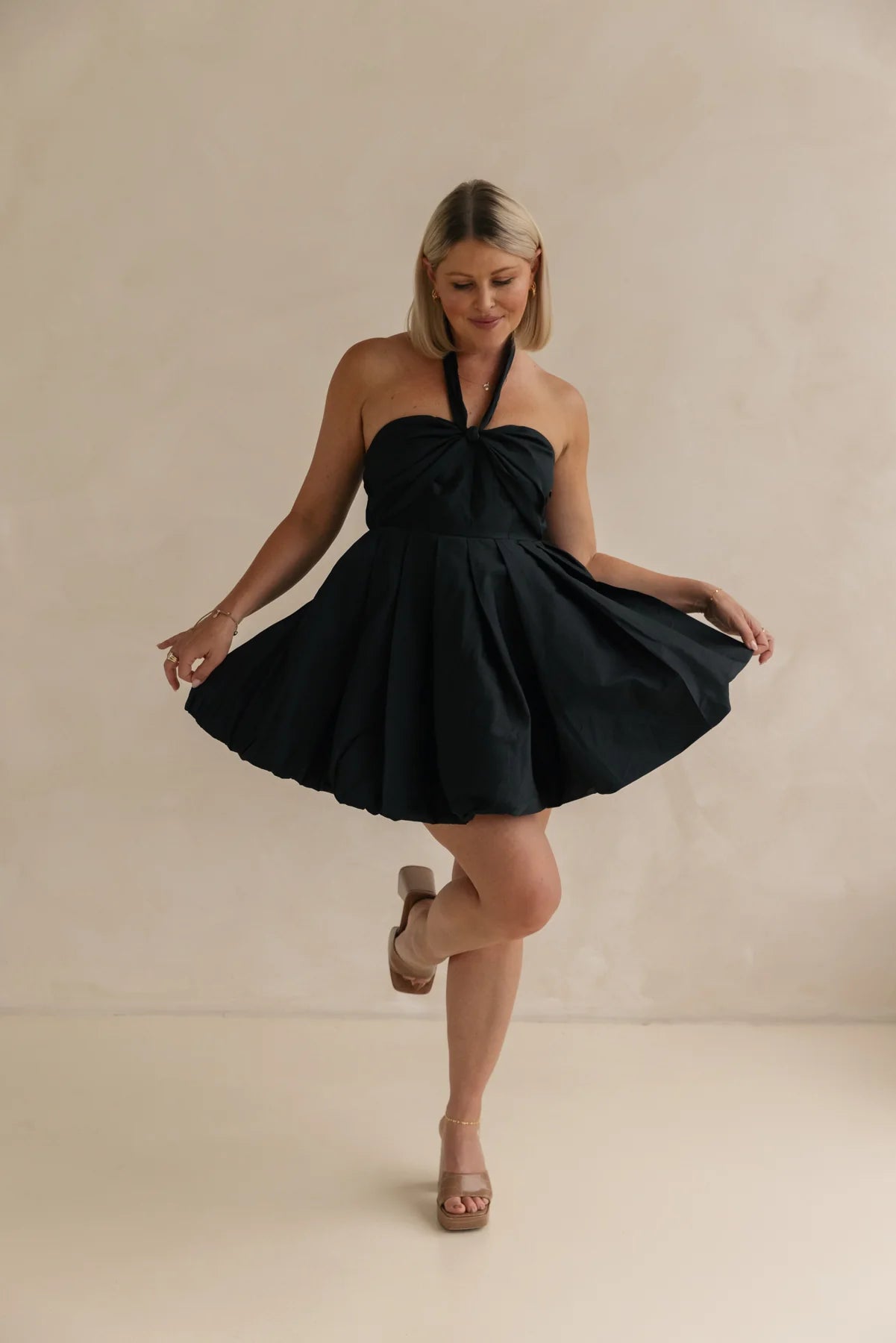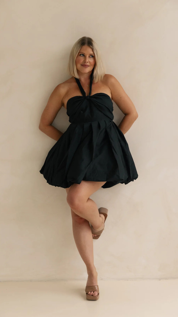 Get ready to turn heads in our adorable Anya Mini Dress in Noir! This cute bubble frock features a playful front bow that can be styled either as a chic neck tie or a charming bow for a whimsical touch. Crafted from lightweight taffeta fabric, the Anya Mini is perfect for warm days and fun outings.