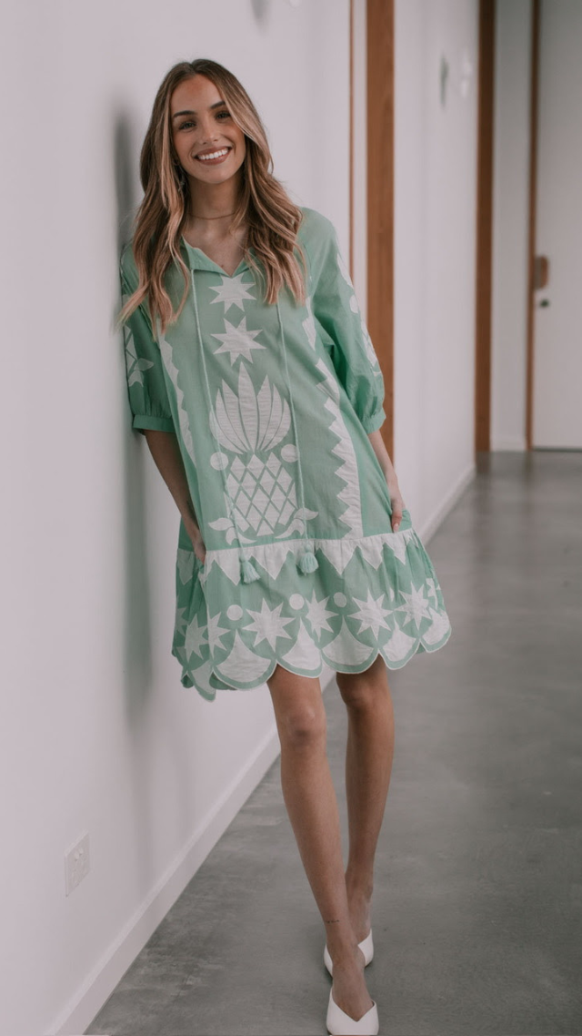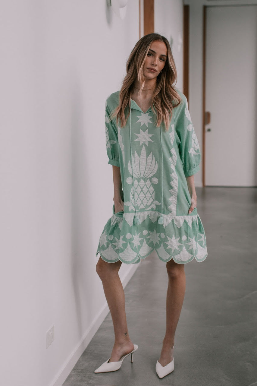 The Etoiles Dress is a love letter to carefree days and starlit nights. With its delicate celestial and pineapple embroidery, soft pastel hues, and scalloped hem, this dress brings a dreamy, romantic energy to your wardrobe. Whether you choose blush pink or refreshing mint, Etoiles is designed to make you feel radiant and relaxed—perfect for brunches, barefoot walks, or sunset soirées.
