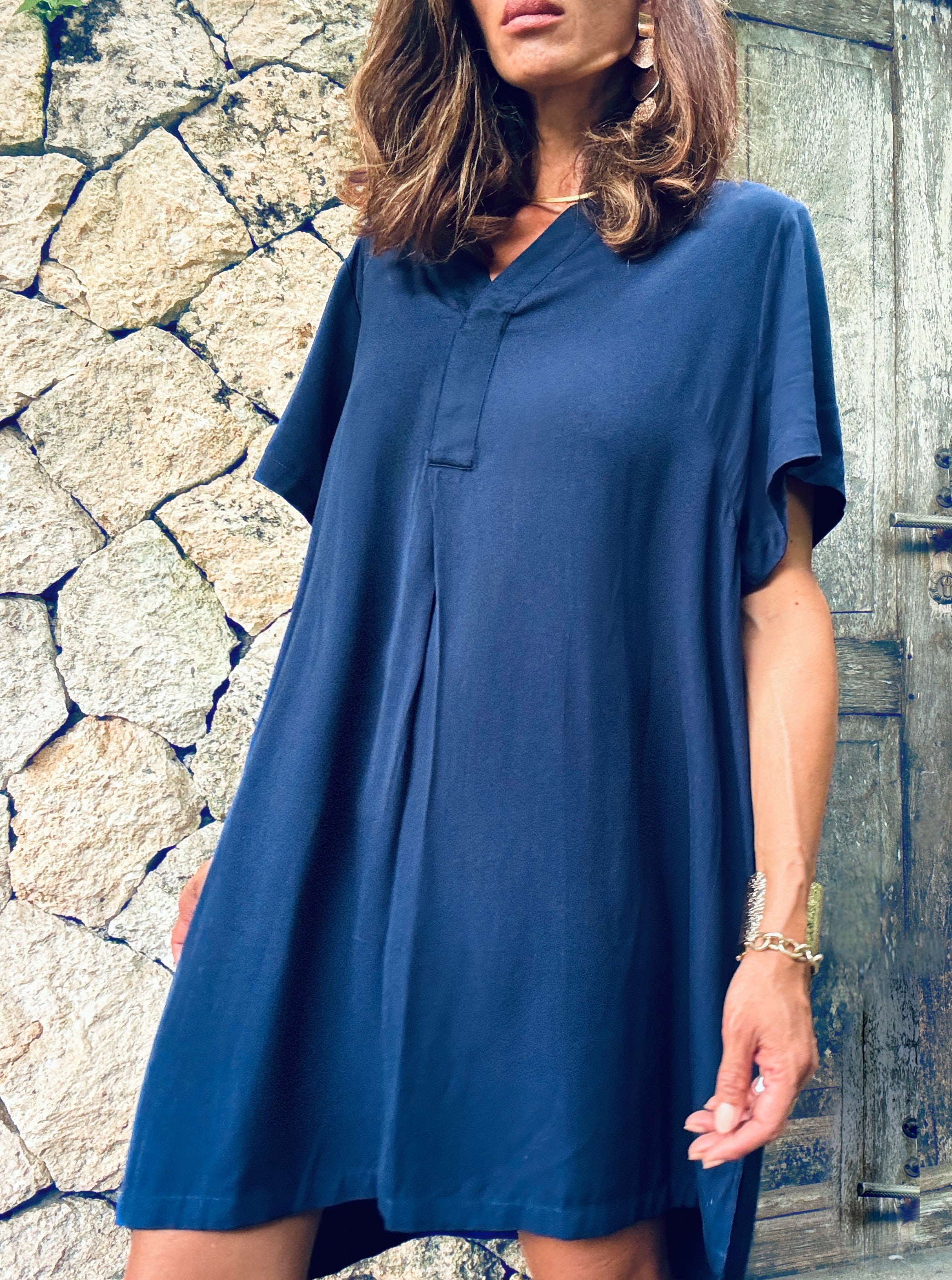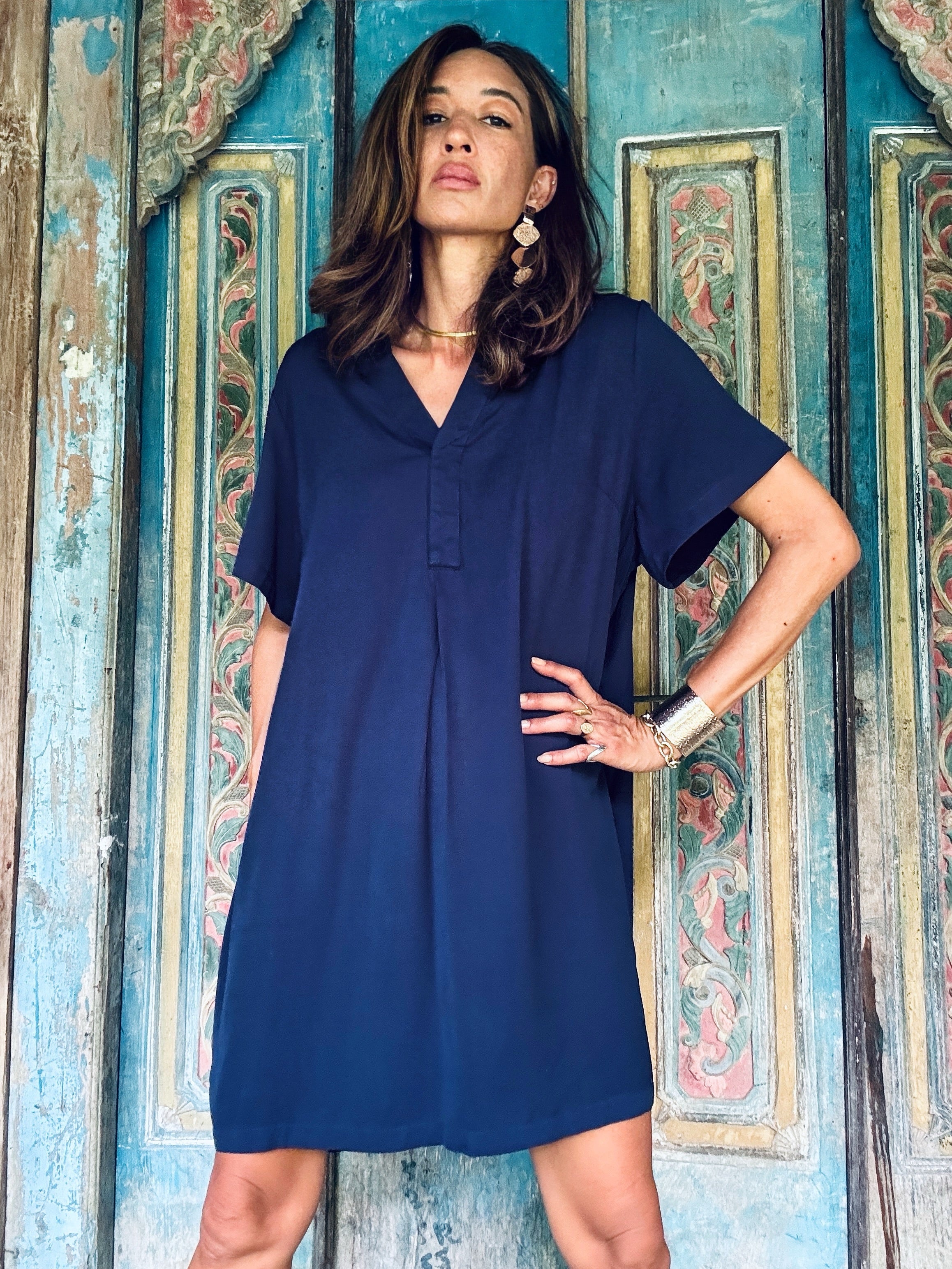 Our Hudson Dress by Kenz & Kate is a timeless staple featuring a flattering V-neckline and short sleeves. Crafted from lightweight rayon, it offers a comfortable, loose fit that’s perfect for any occasion. Style it with a belt for a cinched look or wear it effortlessly loose for a relaxed vibe. Your go-to dress for both casual and elevated moments!