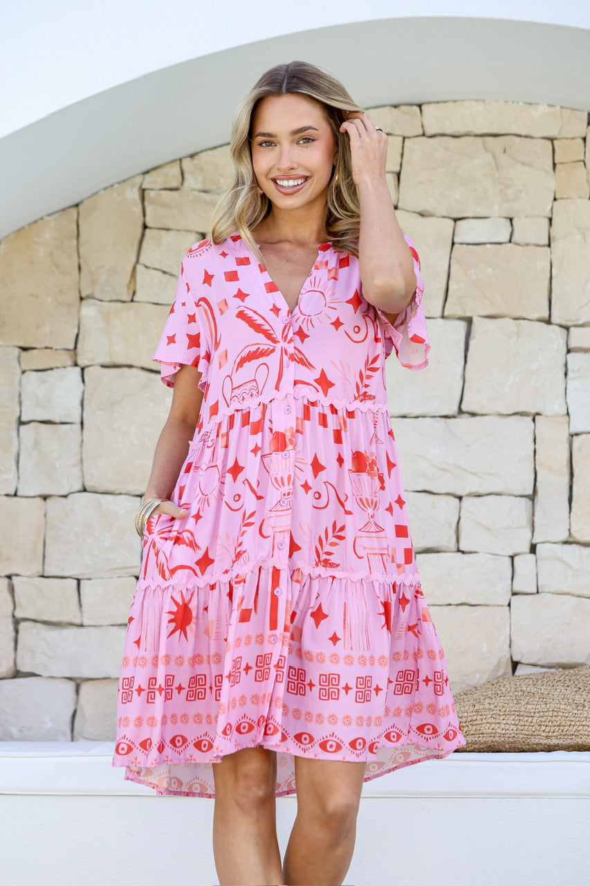 Our Noosa Dress is a breezy, button-down tiered mini dress featuring a playful pink and red print inspired by coastal charm. With flutter sleeves and a relaxed fit, it's the perfect piece for effortless summer style.