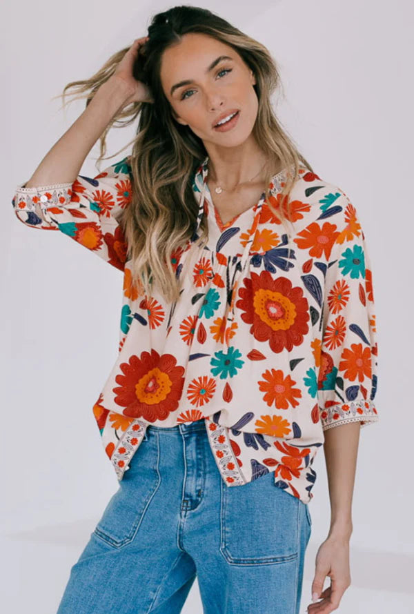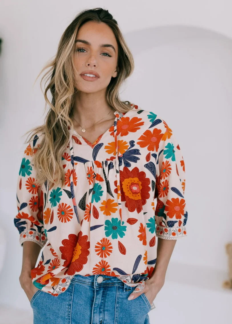 Say hello to effortless charm with the Emelie Top — a playful mix of bold blooms and breezy design that instantly lifts your mood. The vibrant floral print feels like a celebration of sunshine, while the relaxed silhouette and soft gathers at the neckline keep it flattering and easy to wear. With delicate embroidered trims at the sleeves adding a touch of artisanal detail, this is your go-to piece for both everyday chic and weekend adventures.