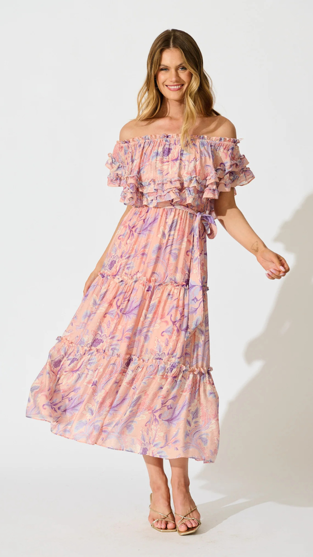 Romantic and playful, the Lucy Dress is made for days that turn into nights. Featuring a soft off-shoulder neckline with cascading layered ruffles, this maxi dress flows effortlessly with its tiered silhouette. The pastel peach base with lilac and purple floral motifs brings a dreamy, feminine charm, while the lightweight fabric and elasticated waist ensure comfort and ease. Perfect for weddings, garden parties, or sunset cocktails.