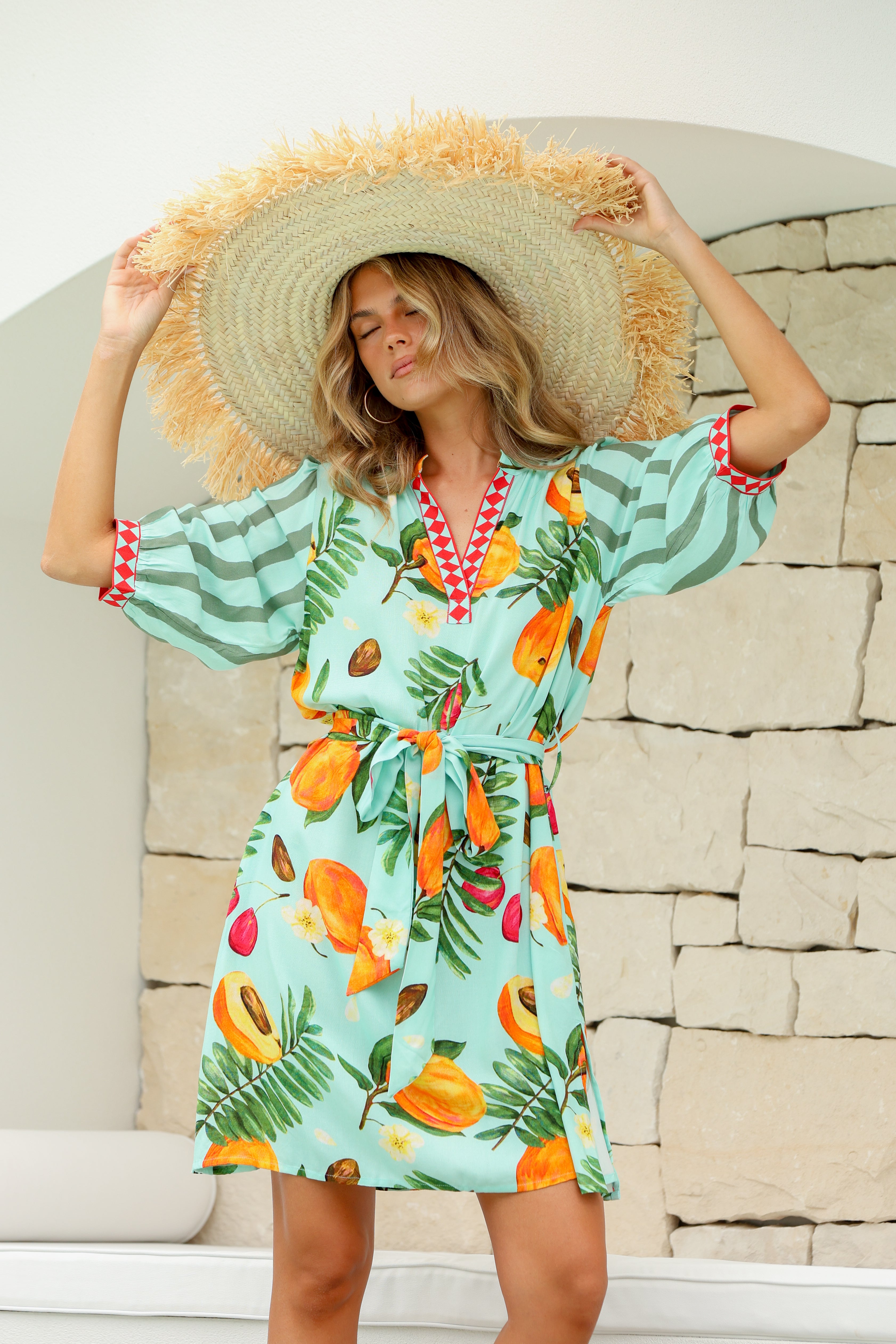 Sweet, sunny and straight from the Amalfi Coast (at least in spirit) — the Italia Dress is your ticket to instant summer style. With its tropical fruit print on a minty base, playful contrast trims, and belted waist, this mini is pure joy in dress form. Whether you're beach-bound or brunch-ready, this piece brings the dolce vita wherever you go.