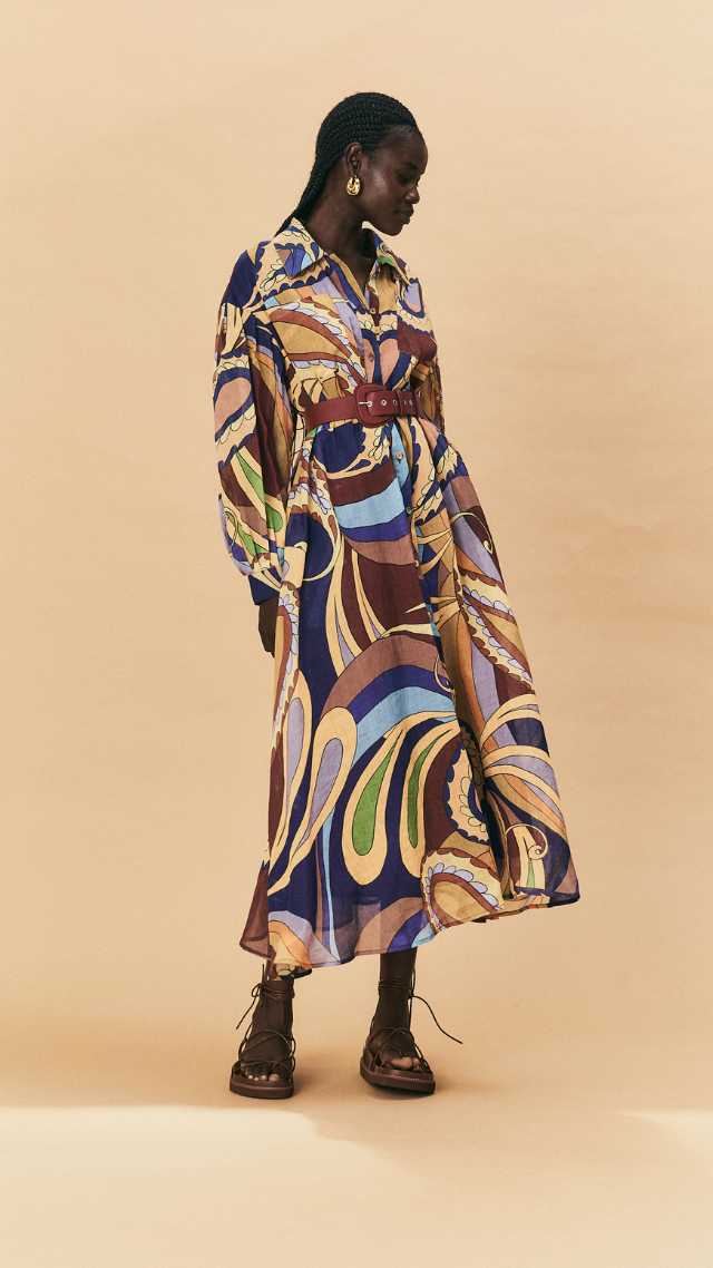 The Dijon Maxi Shirt Dress from La Maise captures the essence of retro glamour with its vivid print and flowing silhouette. Designed with a classic shirt collar and button-down front, it features a matching belt to subtly cinch your waist. Style it with sandals or boots to shift effortlessly from casual days to elevated evenings.