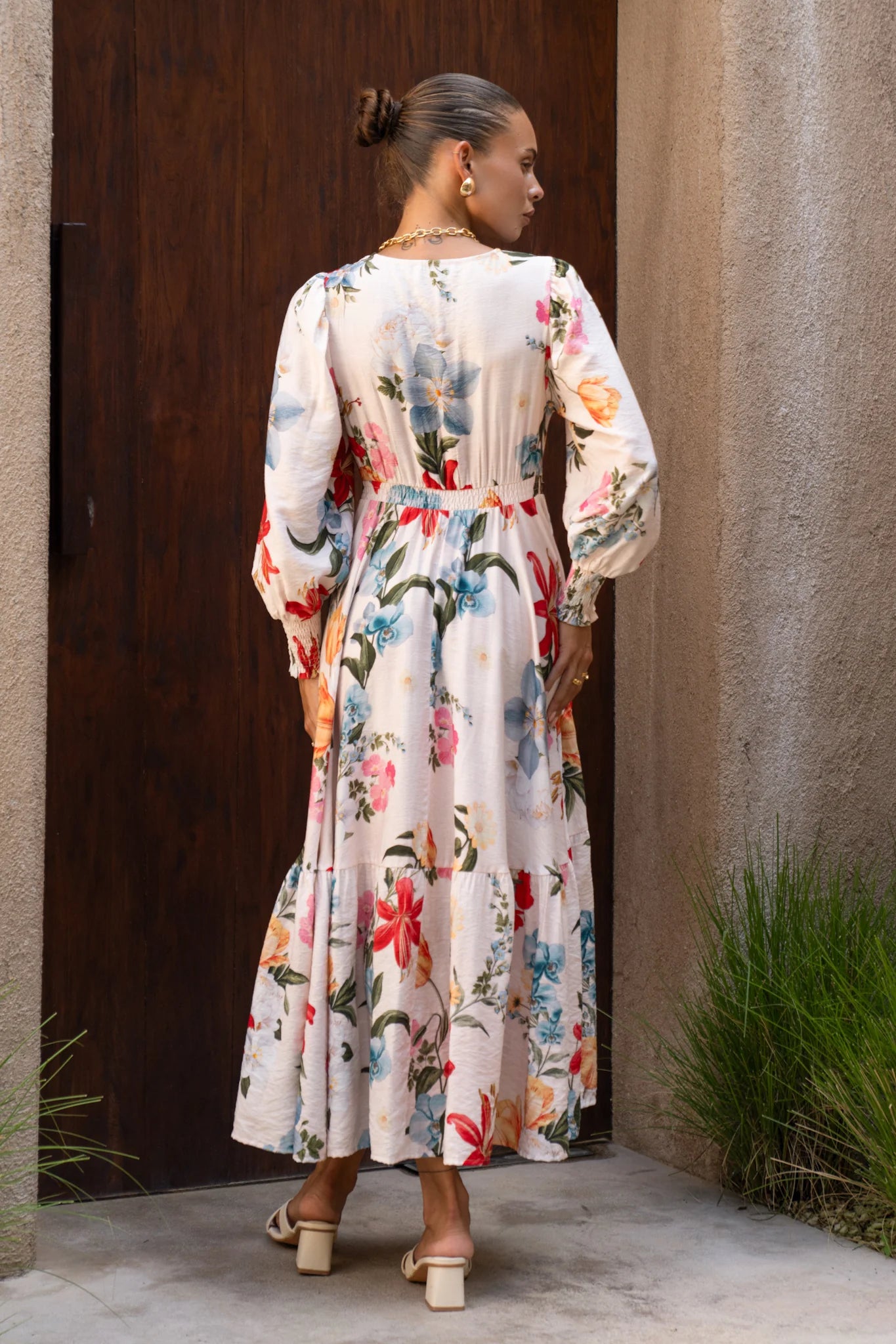 Meet the Parsons Dress — where timeless femininity meets statement florals. Crafted in a soft crinkle-textured fabric and blooming with vibrant lilies, this long sleeve midi is effortlessly flattering with its V-neckline, shaped waistband, and tiered skirt. The puffed sleeves add volume and charm, while smocked cuffs and hidden side pockets make it as practical as it is polished. From weddings to garden parties, this is the dress that brings the drama — in the best way.
