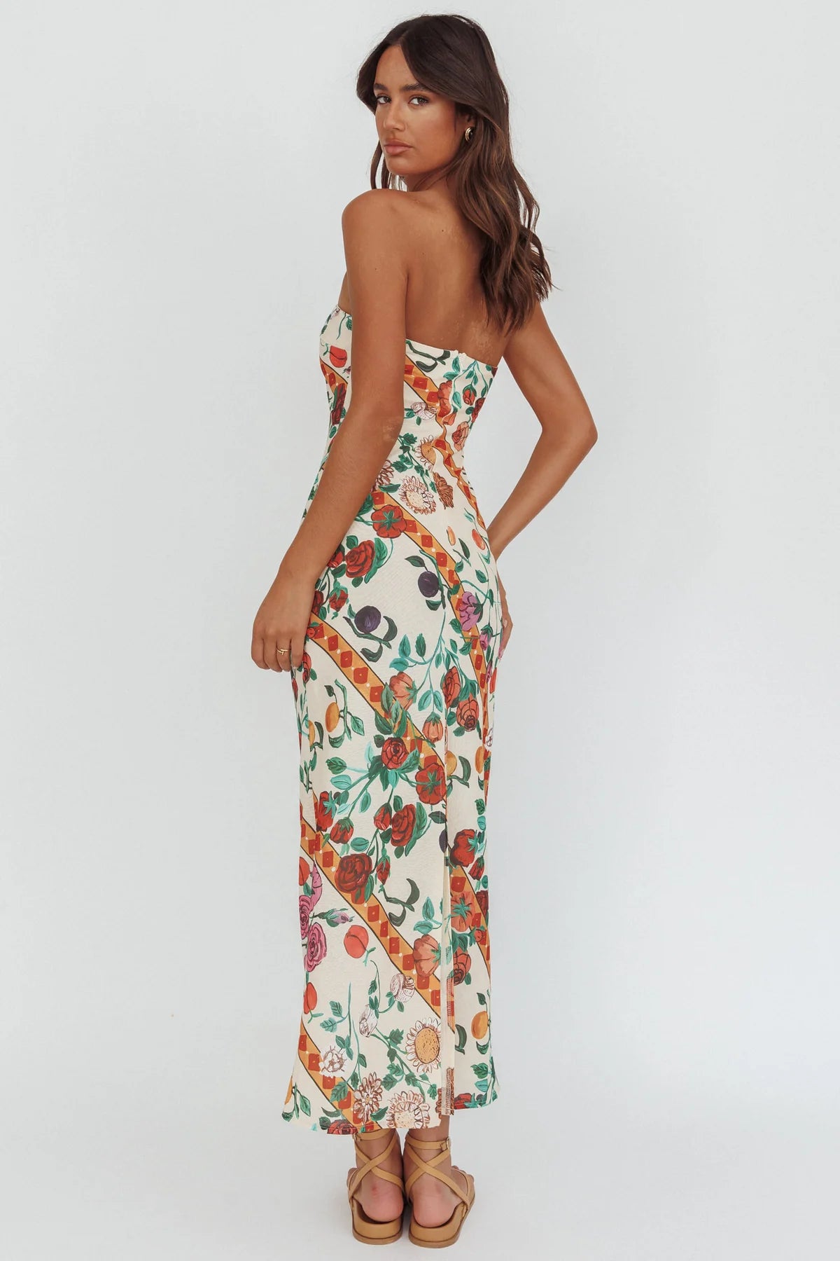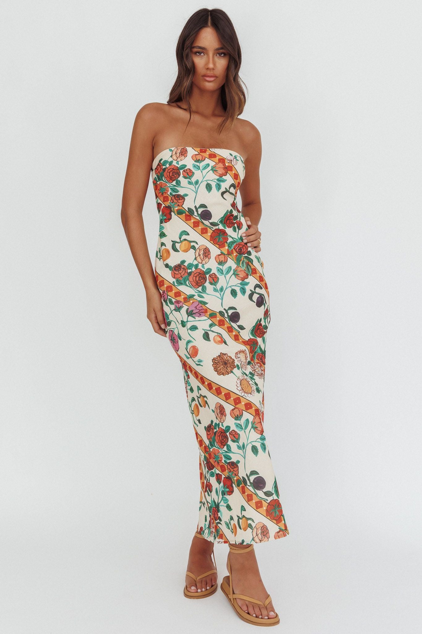 Bold, romantic and straight out of a European summer dream — the Roma Dress brings a touch of la dolce vita to your wardrobe. Designed in a striking vintage floral and fruit stripe print, this strapless midi hugs in all the right places. Wear it with sandals for market strolls or dress it up with a bold earring and heel for balmy nights.
