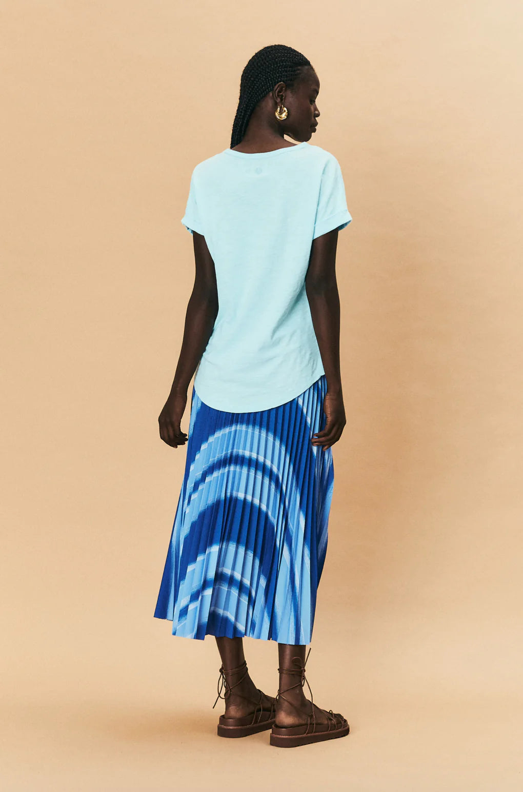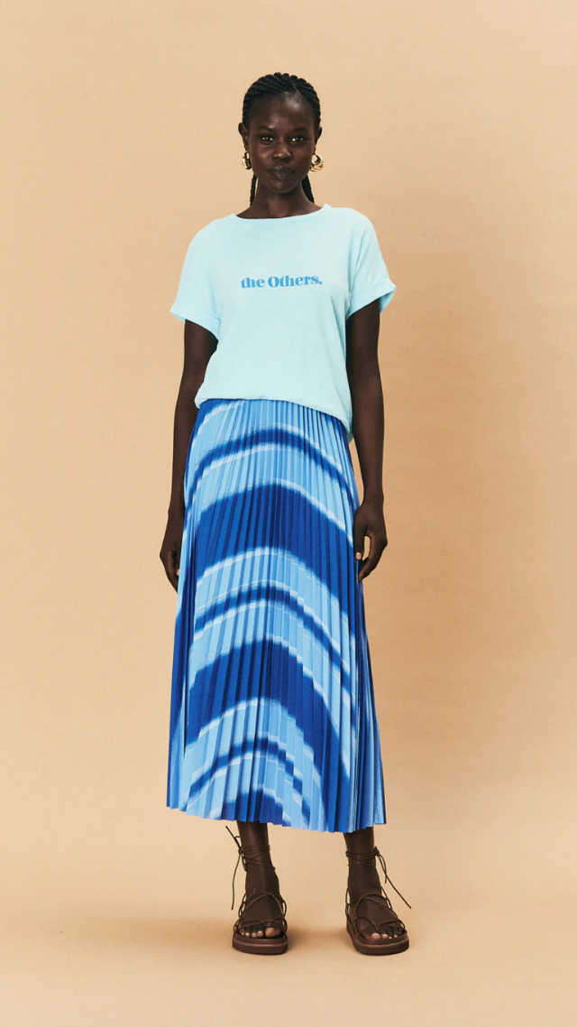 Bring movement and colour to your wardrobe with the Simone Skirt. This pleated midi features a striking wave-like pattern in bold shades of blue, creating an effortless balance of elegance and edge. Designed to sit comfortably at the waist, it flows into a flattering A-line silhouette that moves beautifully with every step. Style it with a tucked-in tee for daytime polish or elevate with a cami and heels for evening chic.
