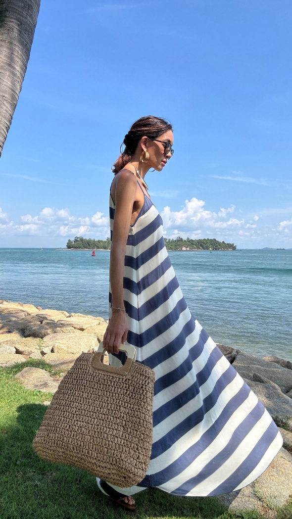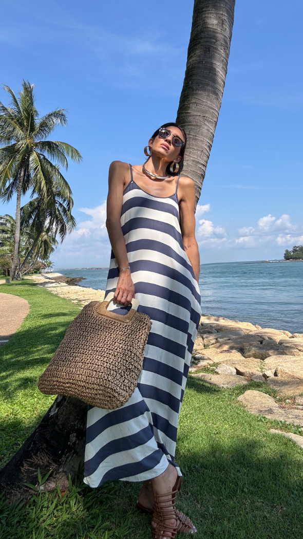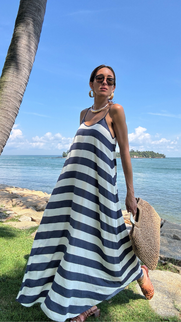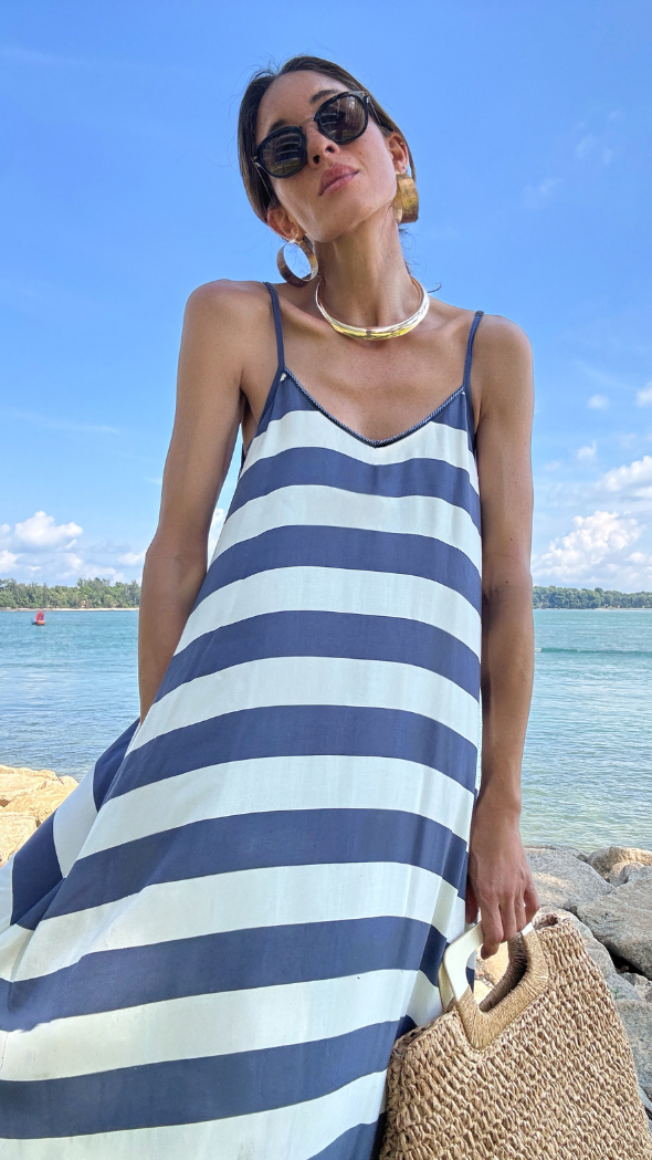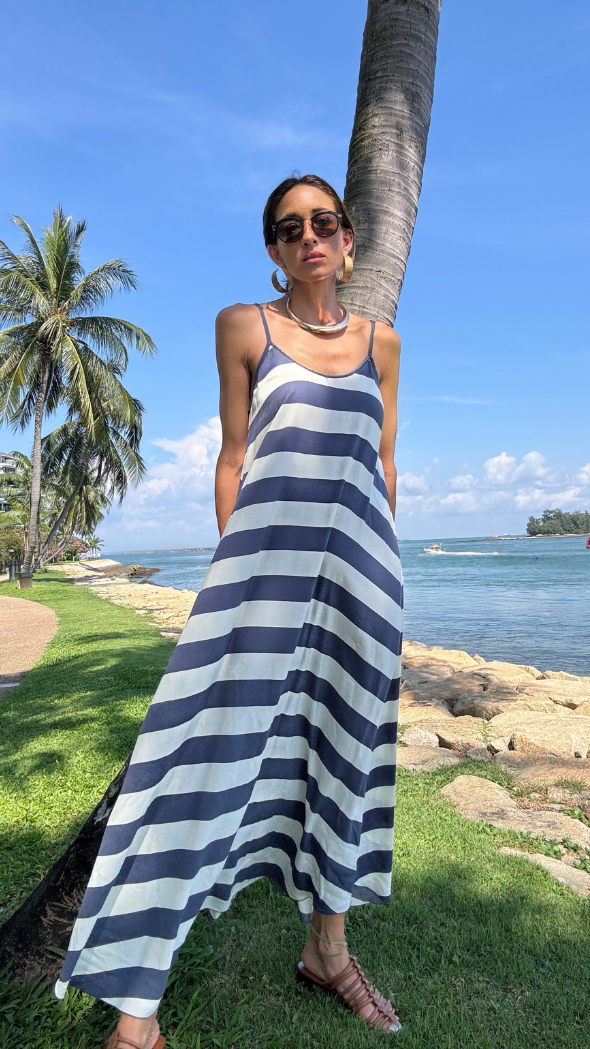 The Monika Dress is your warm-weather escape in a silhouette. With grey stripes and a floaty, A-line cut, this maxi radiates laid-back elegance and coastal charm. Designed with ultra-thin straps and a gently scooped neckline, it feels barely there – perfect for sun-soaked days and balmy nights. Whether you're barefoot on the beach or slipping into sandals for city strolls, Monika moves with you in the dreamiest way.