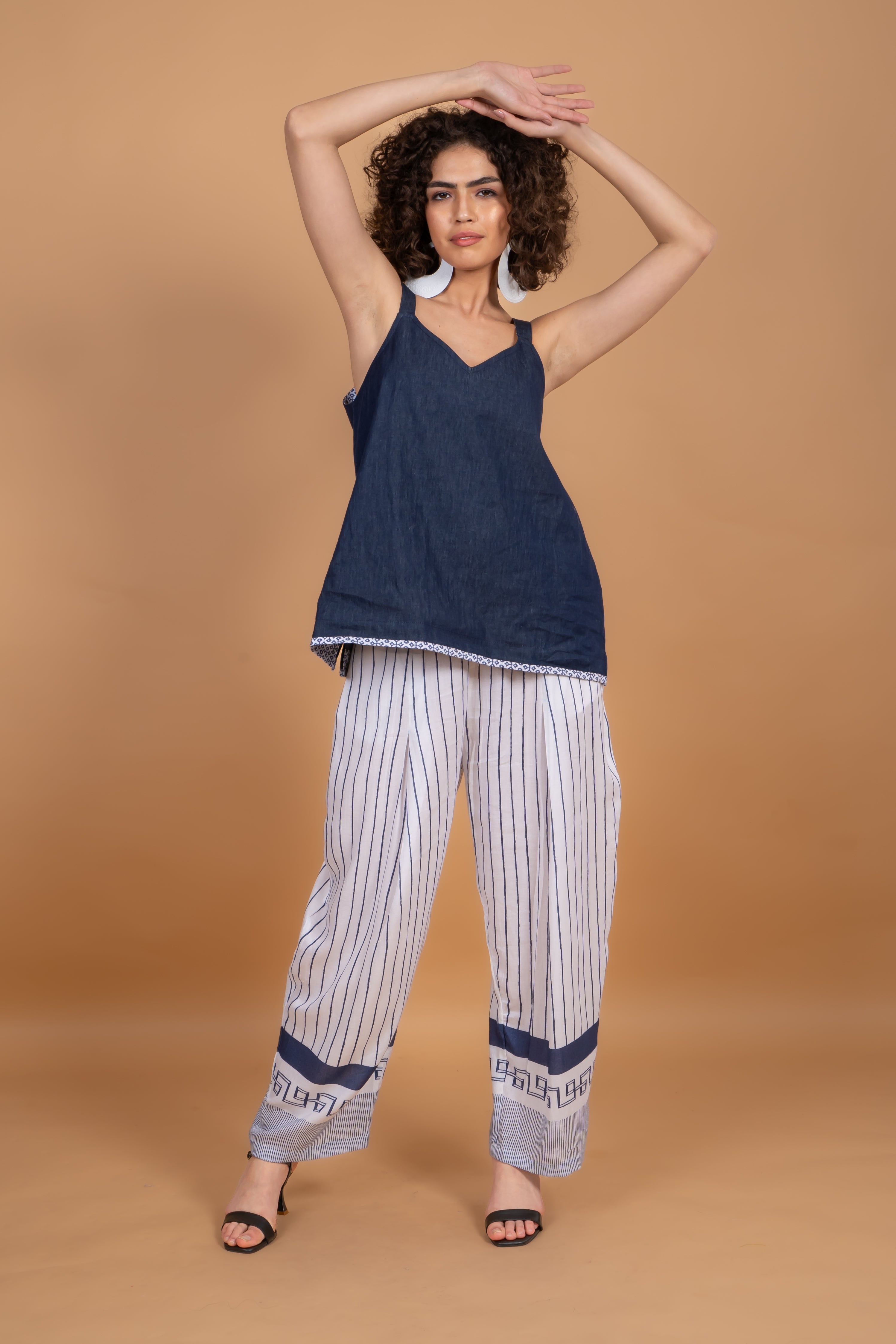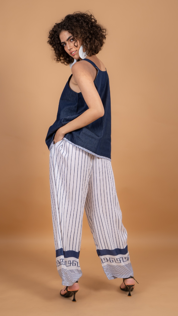 The Jaipur Pants feature a chic navy and white striped design with bold geometric detailing at the hem, blending modern style with timeless elegance. Their lightweight fabric and wide-leg fit make them perfect for effortless, all-day comfort.