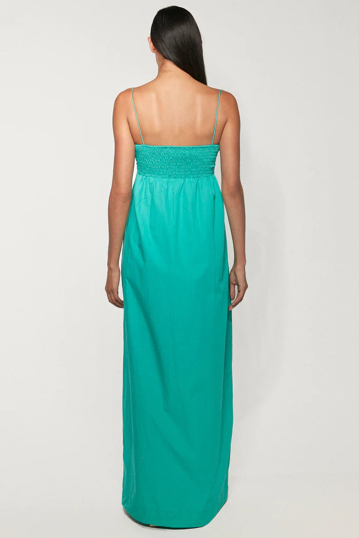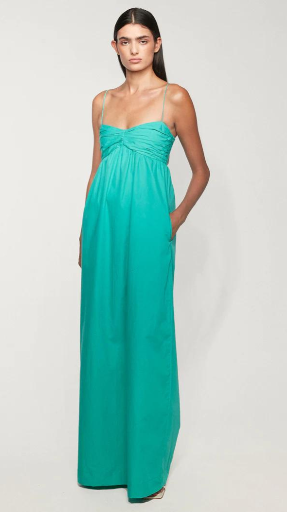 This light and bright maxi features a classic sweetheart neckline ruched for added drama and held by the finest spaghetti straps. The empire waistline falls to a simplistic, floor length skirt that works well with sandals or heels.
