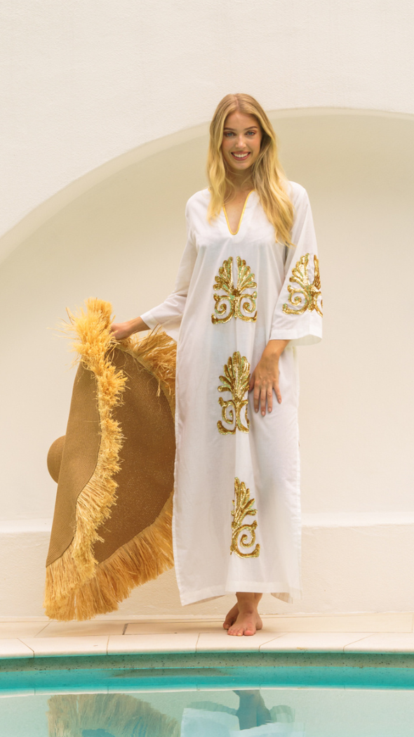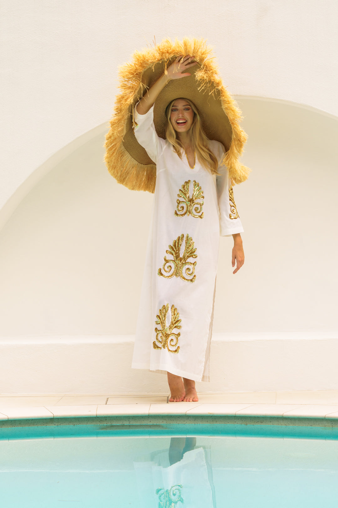 Our Vicky Simone maxi dress is a breezy, full-length white dress adorned with intricate gold sequin detailing, perfect for luxurious beachside relaxation. Its relaxed fit and elegant design make it an effortless blend of comfort and glamour.