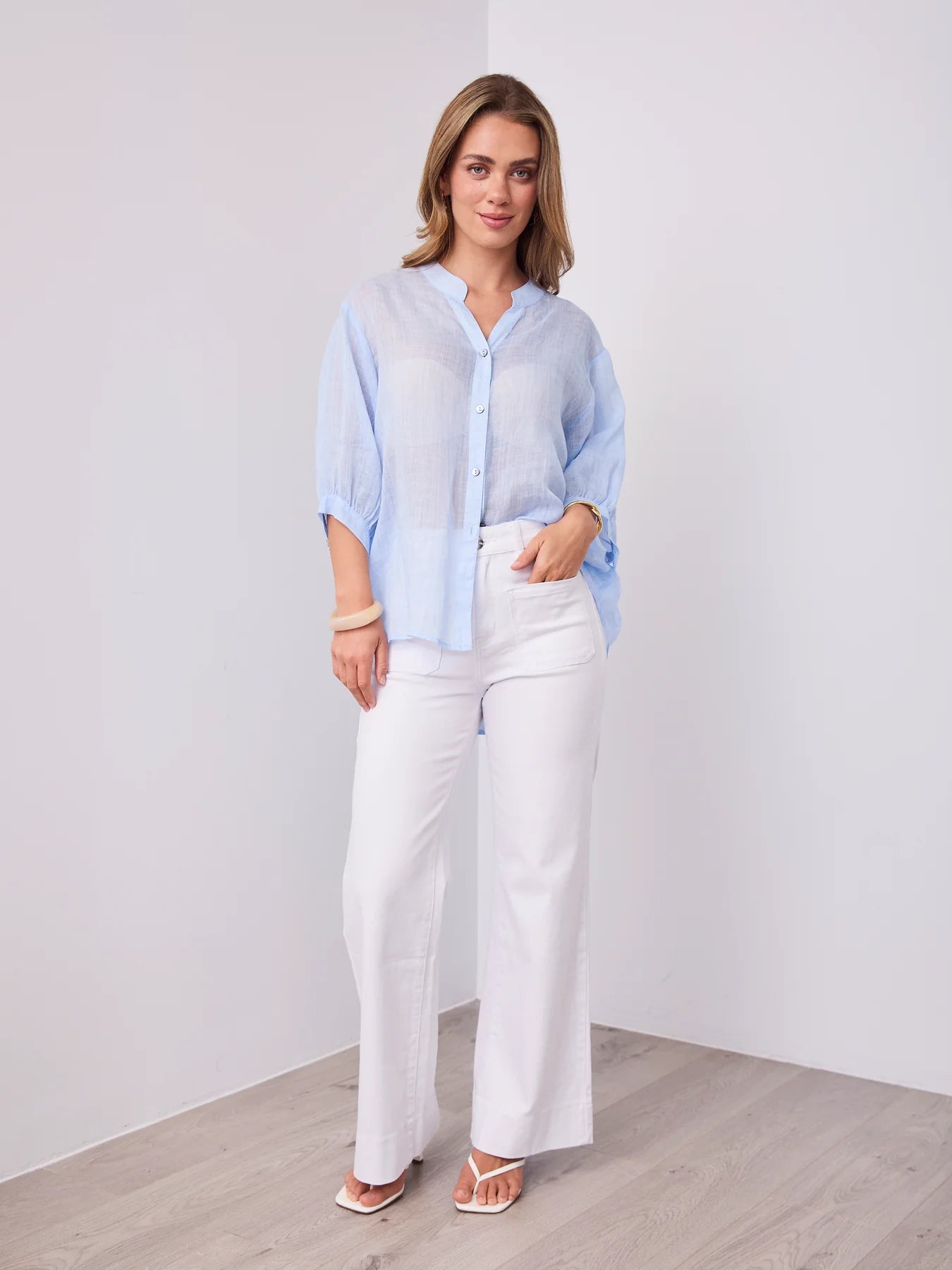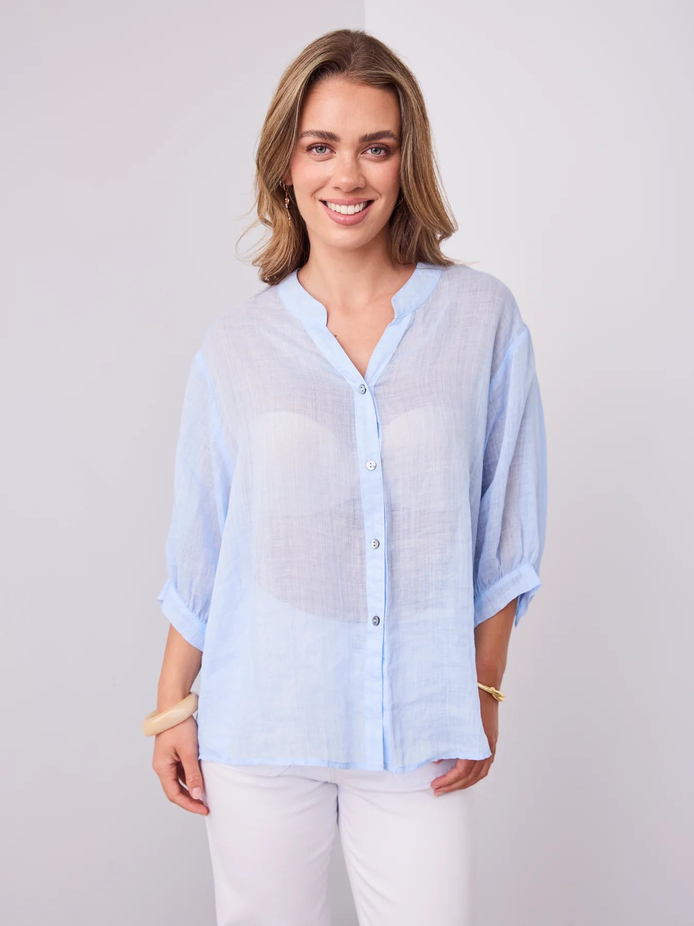 Effortlessly relaxed with elevated details, the Savanna Shirt is your go-to linen essential. Crafted from 100% breathable linen, it features a softly structured mandarin collar, full button-down front, and 3/4 balloon sleeves with gentle gathering for an easy, airy silhouette. Designed to be worn loose or tucked, it’s a seasonless staple you'll reach for year after year.