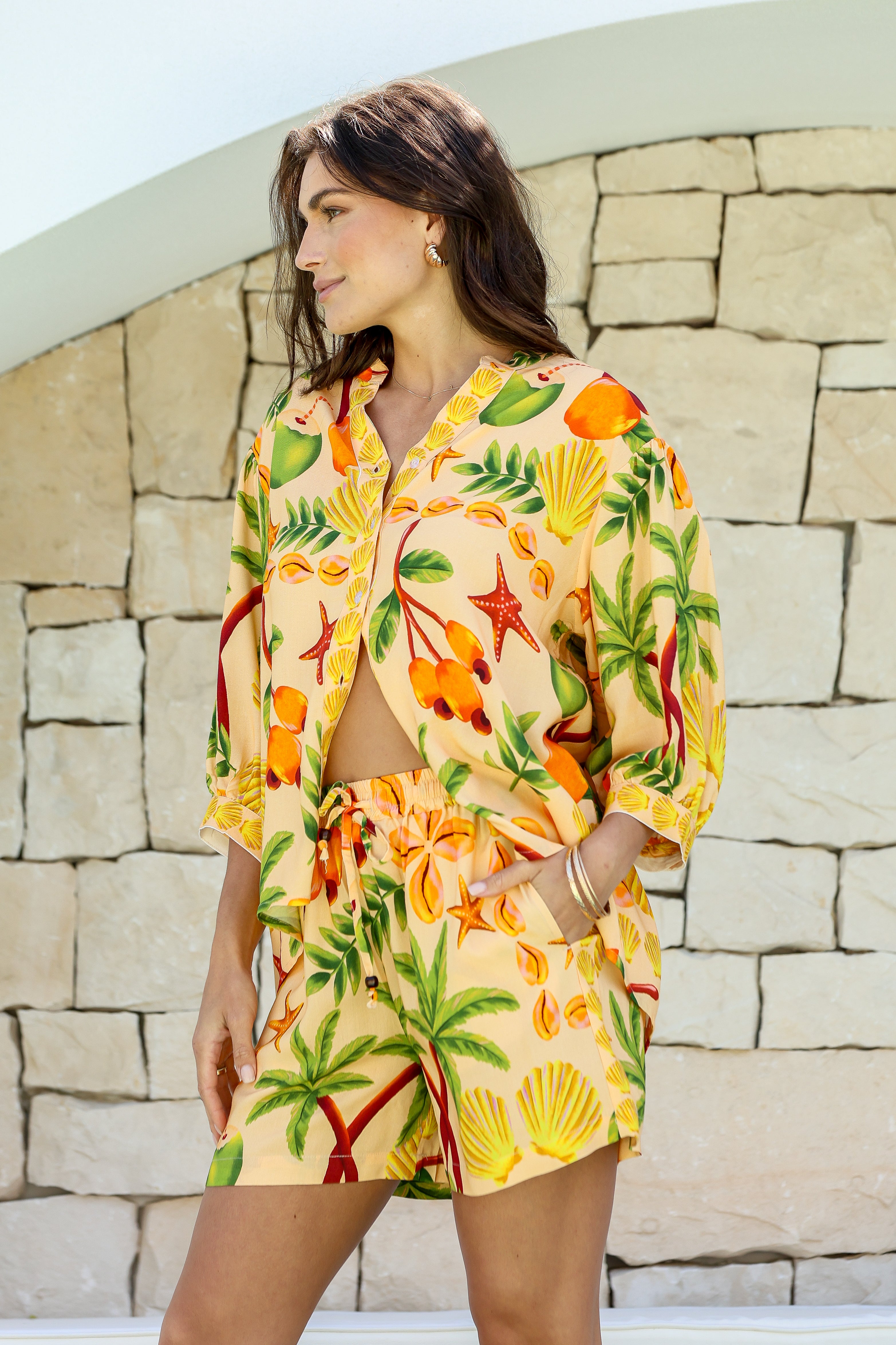 Say hello to sunshine in the Diego shirt set, a joyful set splashed with citrus fruits, tropical palms, starfish, and seashells in a lush hand-painted print that practically hums with holiday vibes. The oversized button-down shirt features dropped shoulders and breezy sleeves for an effortless, thrown-on feel. The shorts have a relaxed fit, elasticated drawstring waist, and side pockets – comfort and cute, sorted.
