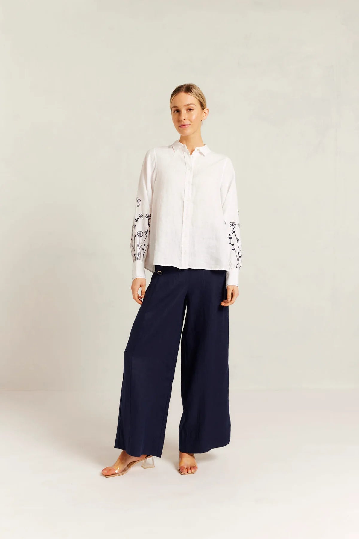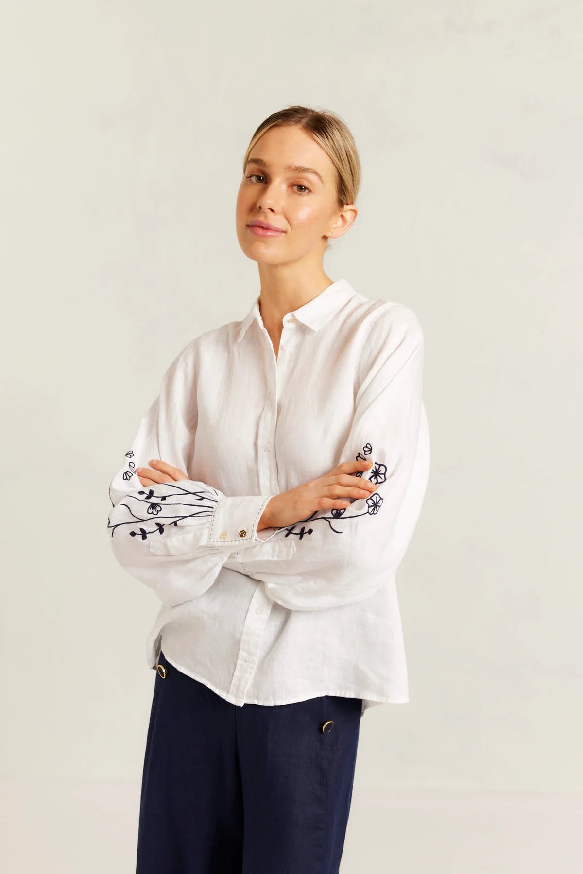 Our Calla Linen Shirt is a classic white button-down with a modern twist, featuring elegant navy floral embroidery on the sleeves. Made from breathable linen, it’s a perfect blend of sophistication and comfort for everyday style.