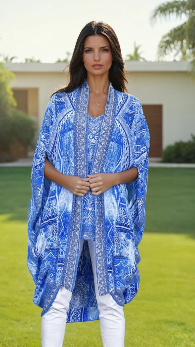 Step into effortless elegance with the Long Cape in Monet, a showstopping layer designed to transform any outfit. With its flowing silhouette and intricate sapphire-and-ivory print, this piece feels like wearable art. The open-front design makes it perfect for slipping over jeans and a camisole for chic daytime outings, or draping over resortwear for sunset cocktails by the sea. Lightweight yet dramatic, it’s the kind of piece that turns heads and makes you feel instantly glamorous.