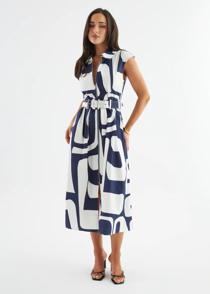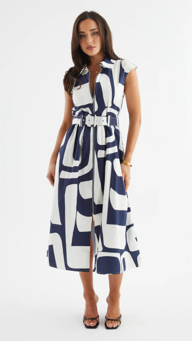 The Ashcroft Dress channels vintage cool with a contemporary twist. Featuring oversized abstract prints and a sharp collared neckline, this belted midi is all about confident style and clean lines. Whether you choose deep navy or earthy coffee, it’s the kind of dress that turns a simple outing into a power moment. Think art gallery energy meets city brunch sophistication.