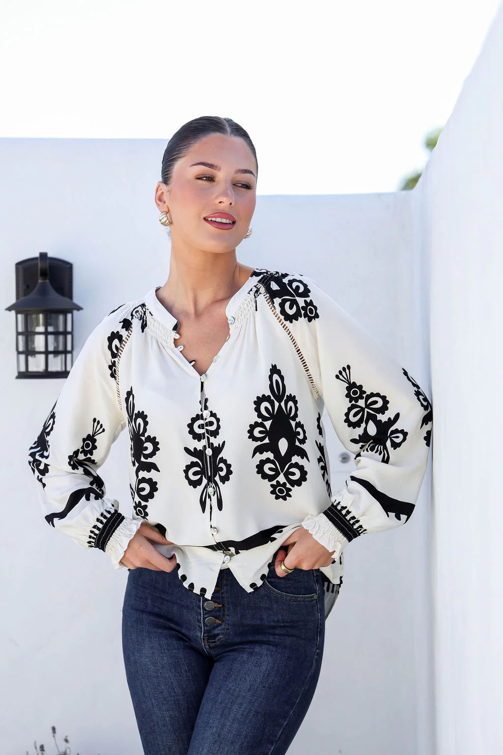 This lightweight, button-down silhouette is framed with intricate shoulder smocking, gathered cuffs, and subtle ladder lace details. Dress it up with tailored trousers, go relaxed with denim, or pair it with linen shorts for poolside chic.
