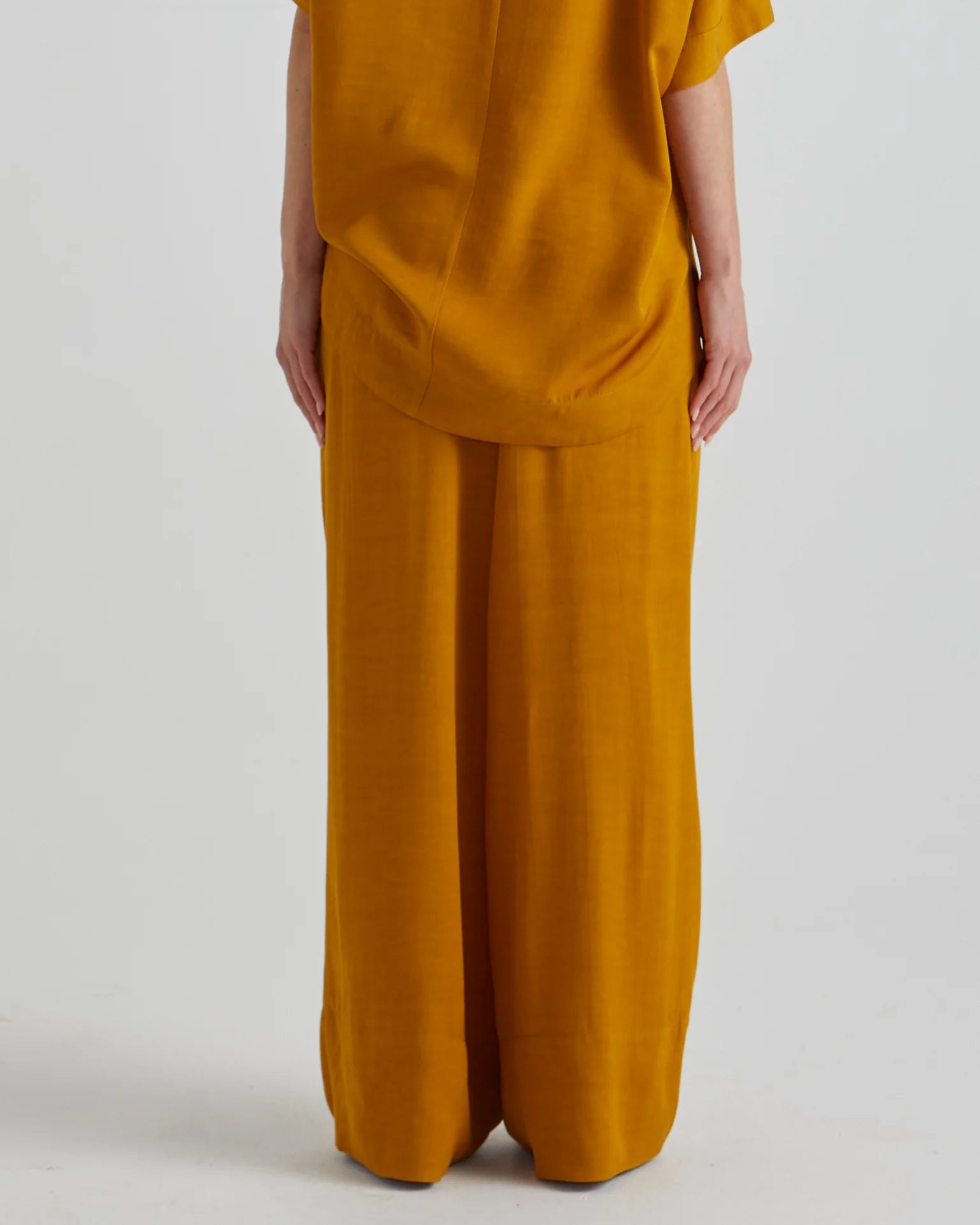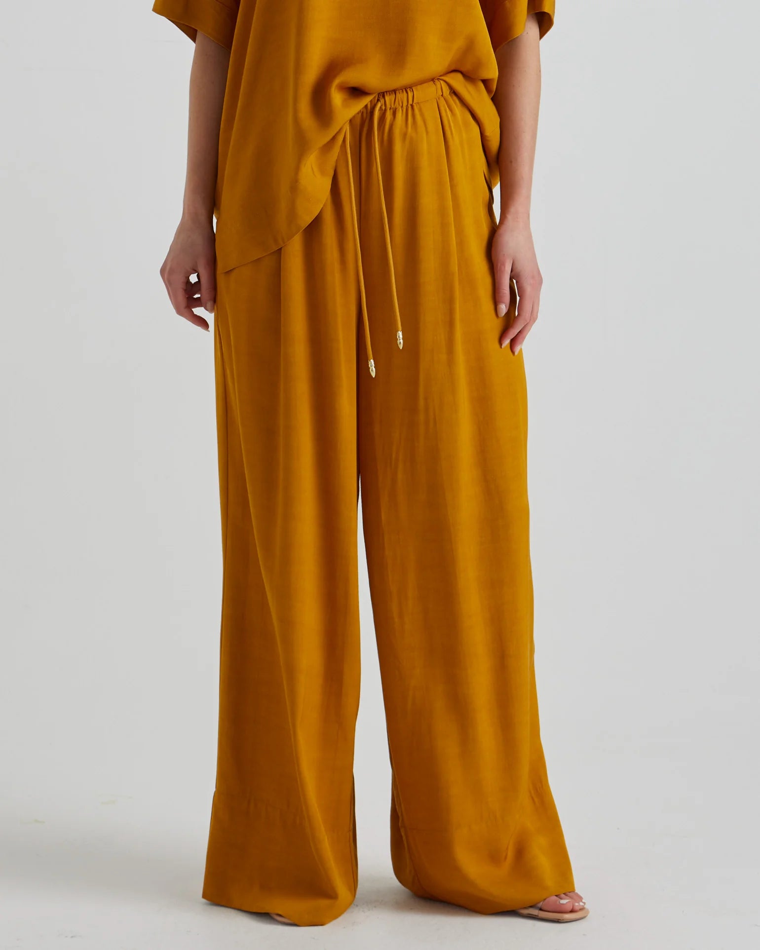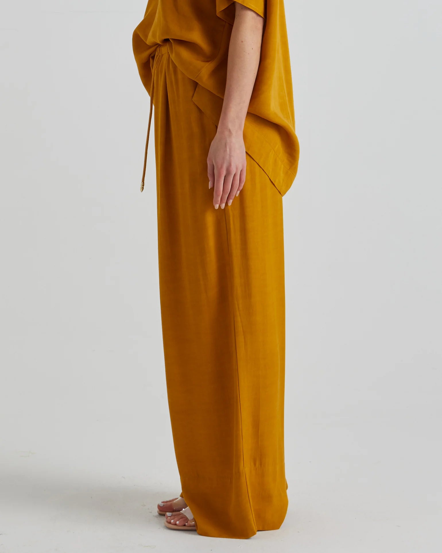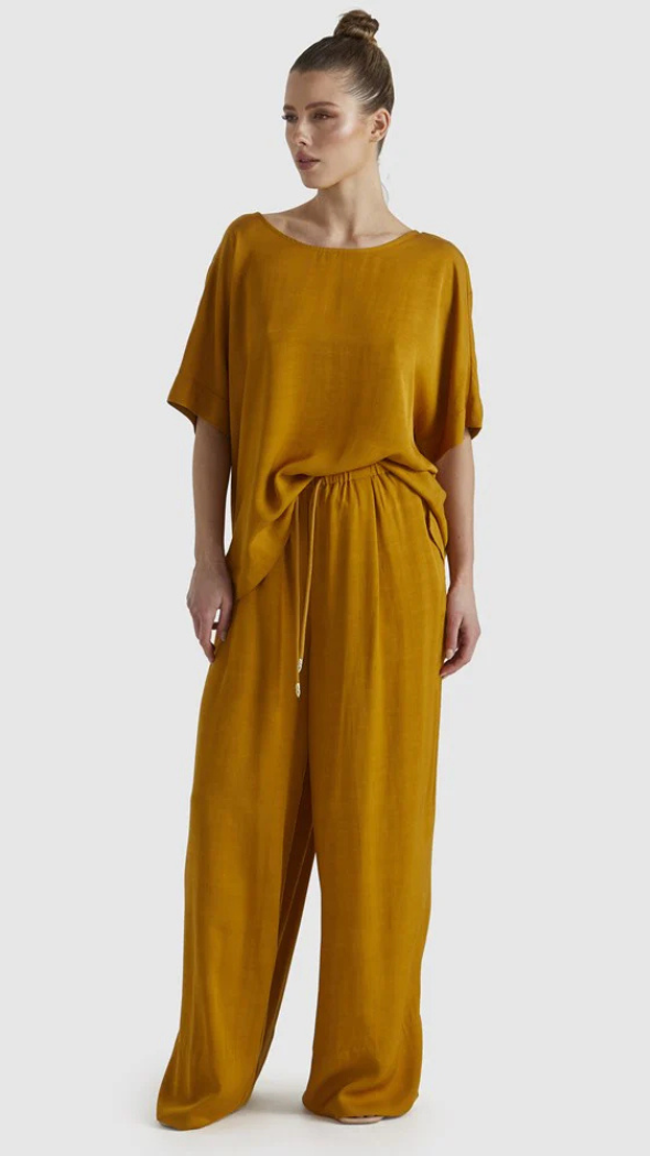 The Fusion Pants is a chic yet versatile choice. It features an elasticated waistband and gold-accented drawcords. The functional side pockets and relaxed fit make this a refined essential for effortless styling.